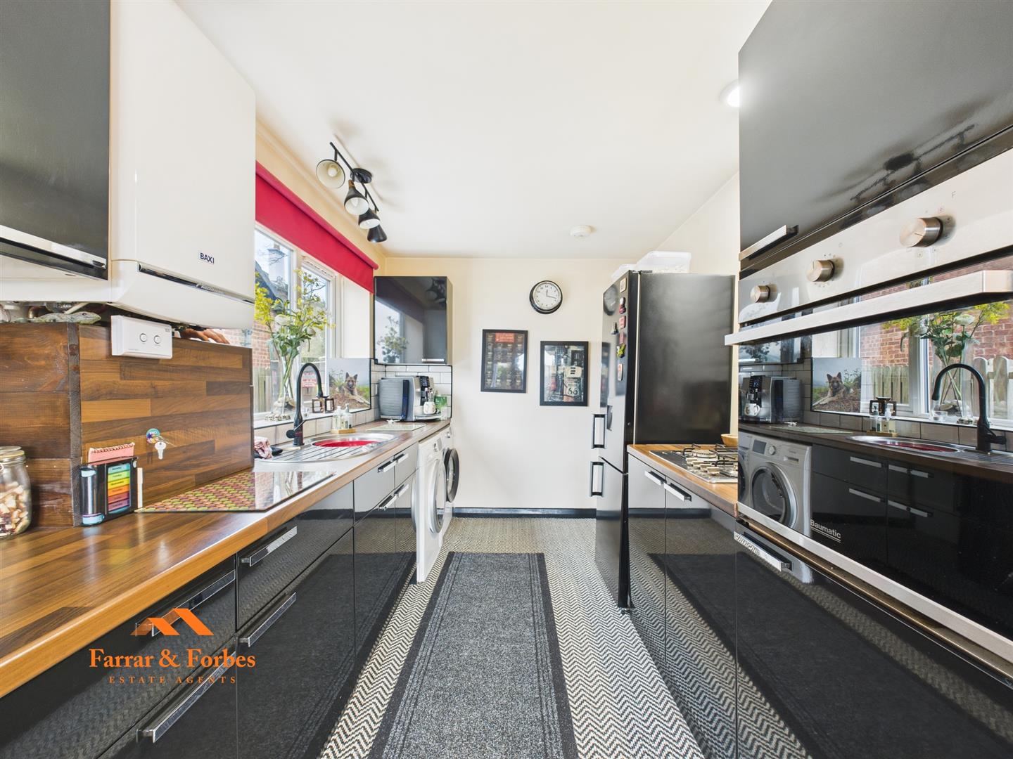 The open-plan kitchen diner is a standout feature, fitted with glossy black wall, base, and drawer units with contrasting work surfaces. Patio doors from the dining area open out to the rear garden, while a characterful stained-glass window adds charm and warmth to the space.