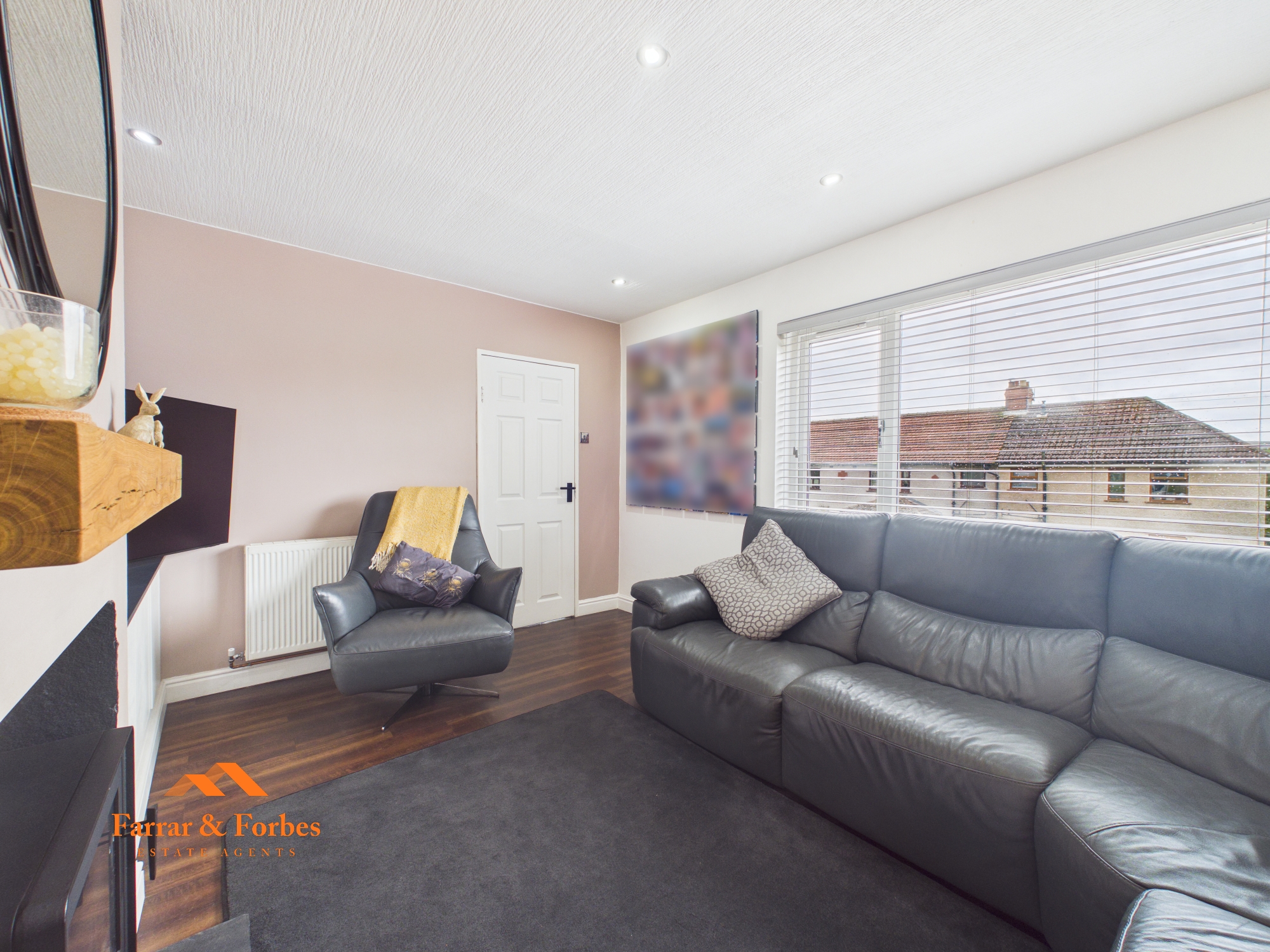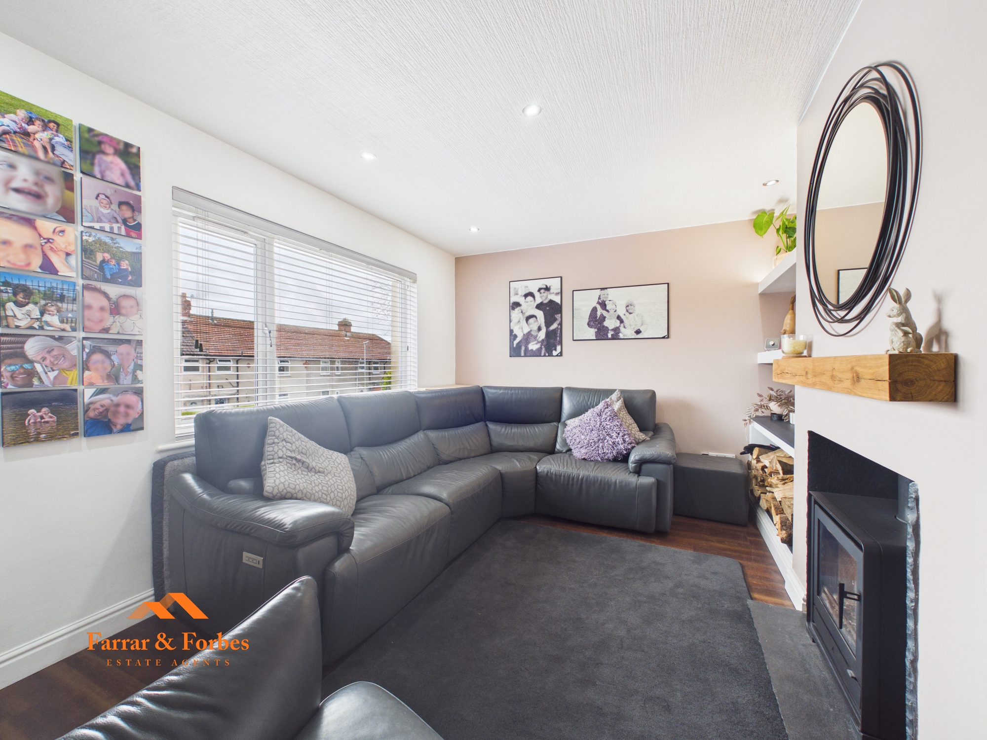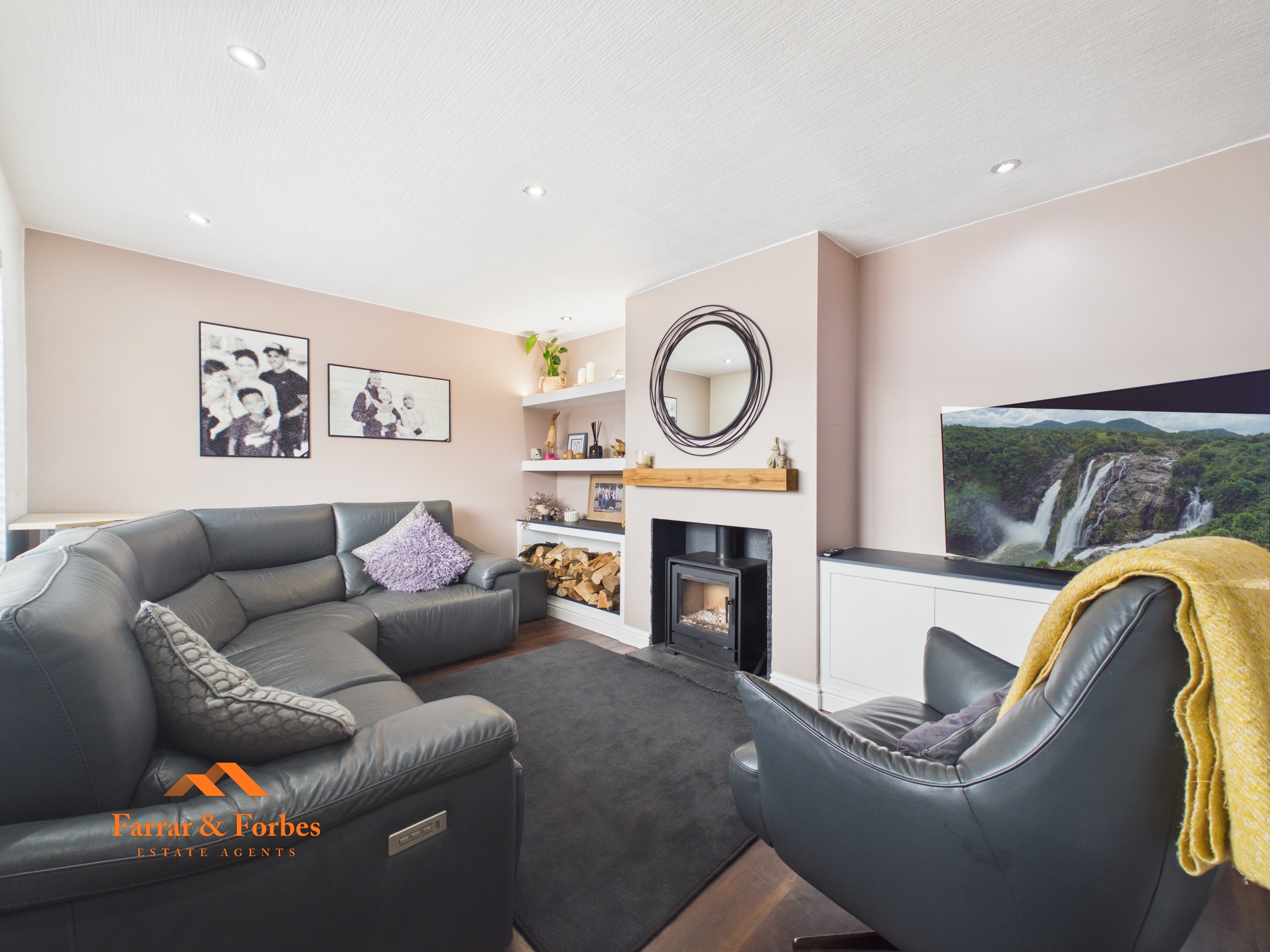 To the front of the property is a garden area, along with convenient side access leading to the rear. Upon entering, you are welcomed by a tiled hallway which leads into a cosy lounge, featuring a charming log burner set upon a timber hearth with an attractive brick slip surround.
