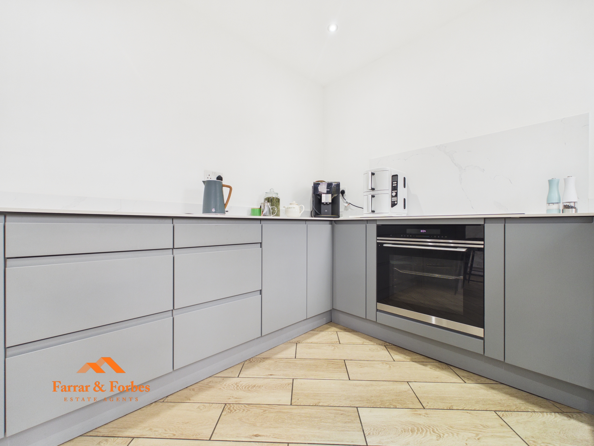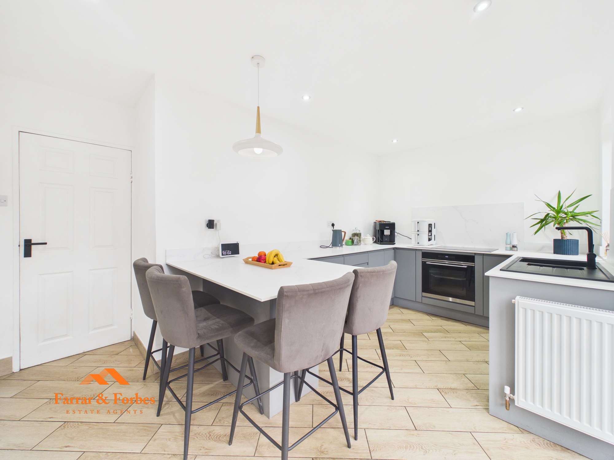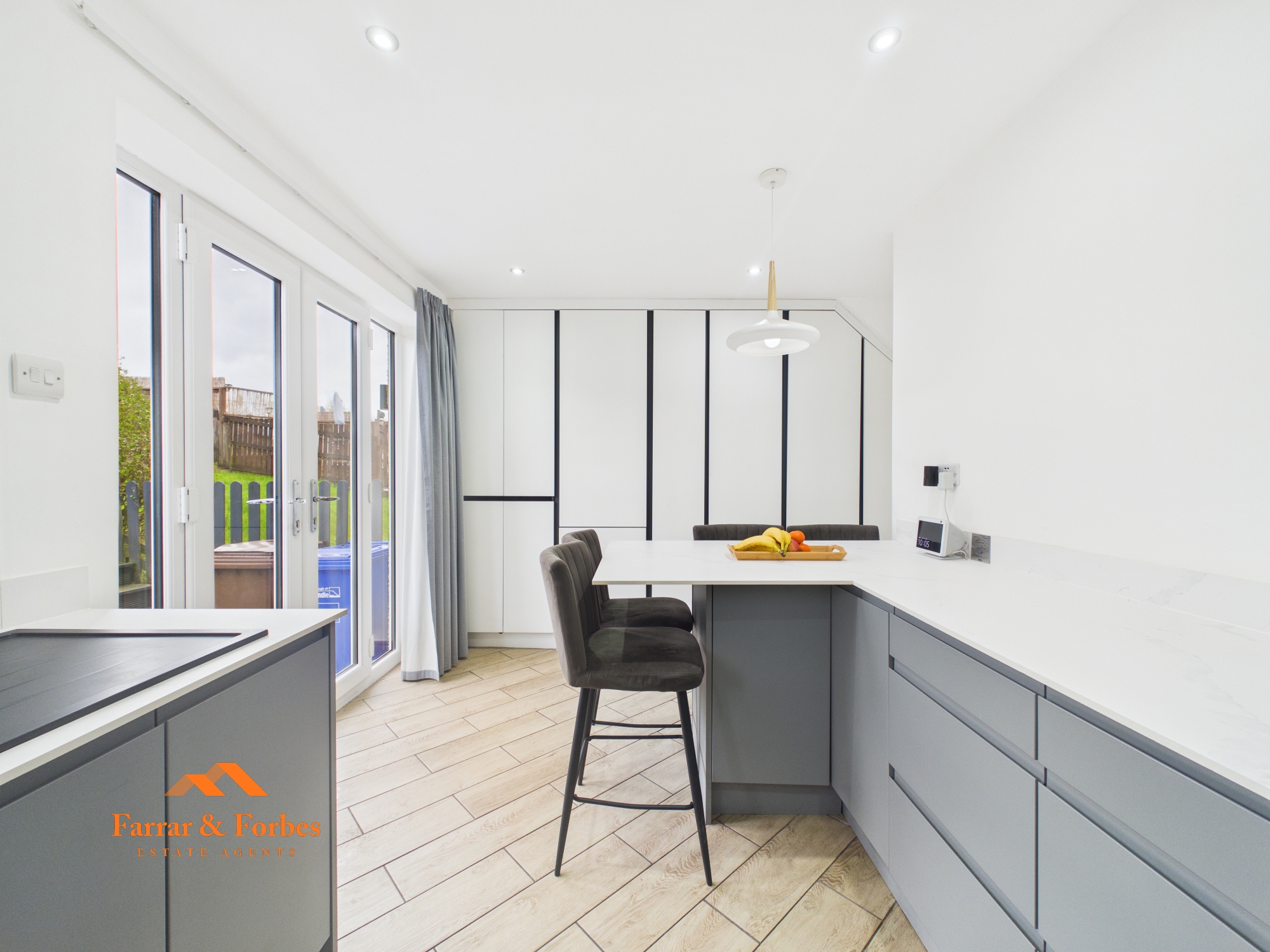 To the rear is a stunning fitted kitchen, thoughtfully designed in a horseshoe arrangement. The kitchen boasts contemporary handleless units, with the main cabinetry in a sleek matte grey, complemented by contrasting white units housing the fridge/freezer and utility storage. Marble-effect worktops wrap around the space and incorporate a five-ring induction hob and electric oven. A breakfast bar provides additional dining space, while patio doors open out onto the rear garden, creating a seamless indoor-outdoor flow.