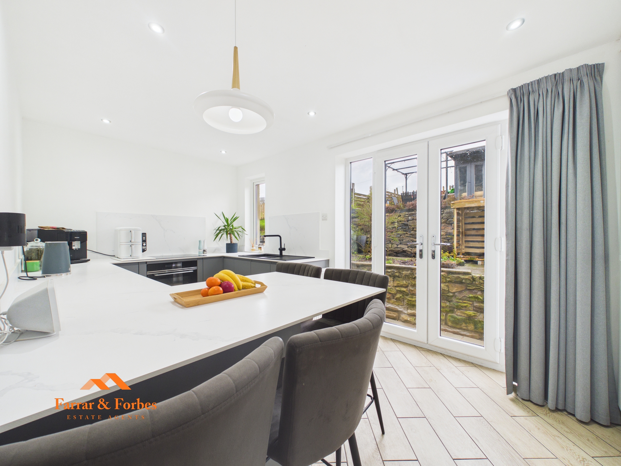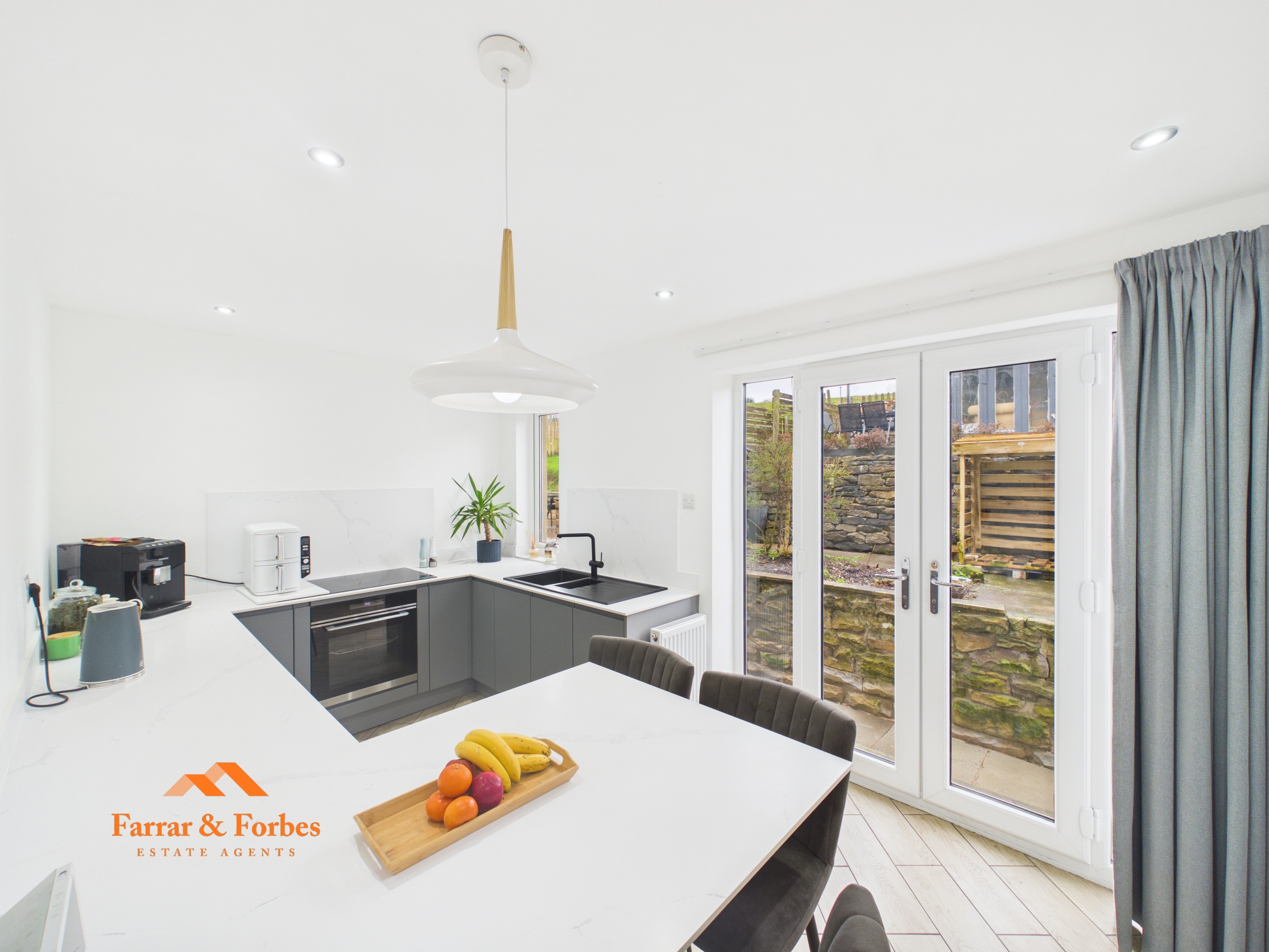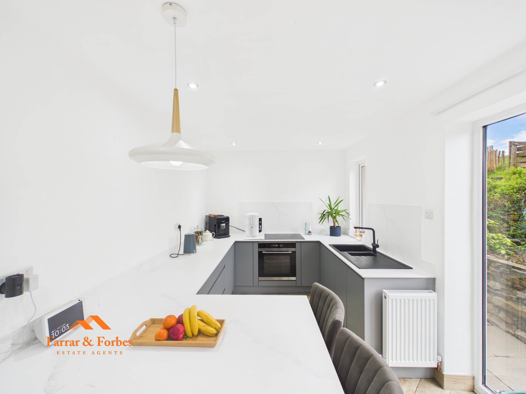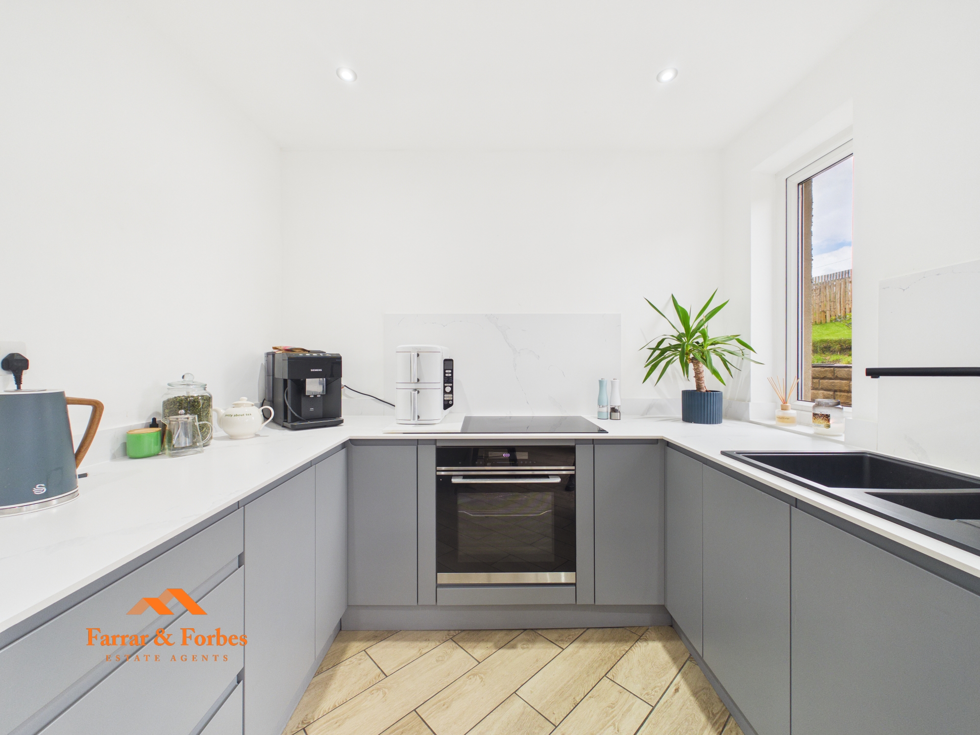 To the rear is a stunning fitted kitchen, thoughtfully designed in a horseshoe arrangement. The kitchen boasts contemporary handleless units, with the main cabinetry in a sleek matte grey, complemented by contrasting white units housing the fridge/freezer and utility storage. Marble-effect worktops wrap around the space and incorporate a five-ring induction hob and electric oven. A breakfast bar provides additional dining space, while patio doors open out onto the rear garden, creating a seamless indoor-outdoor flow.