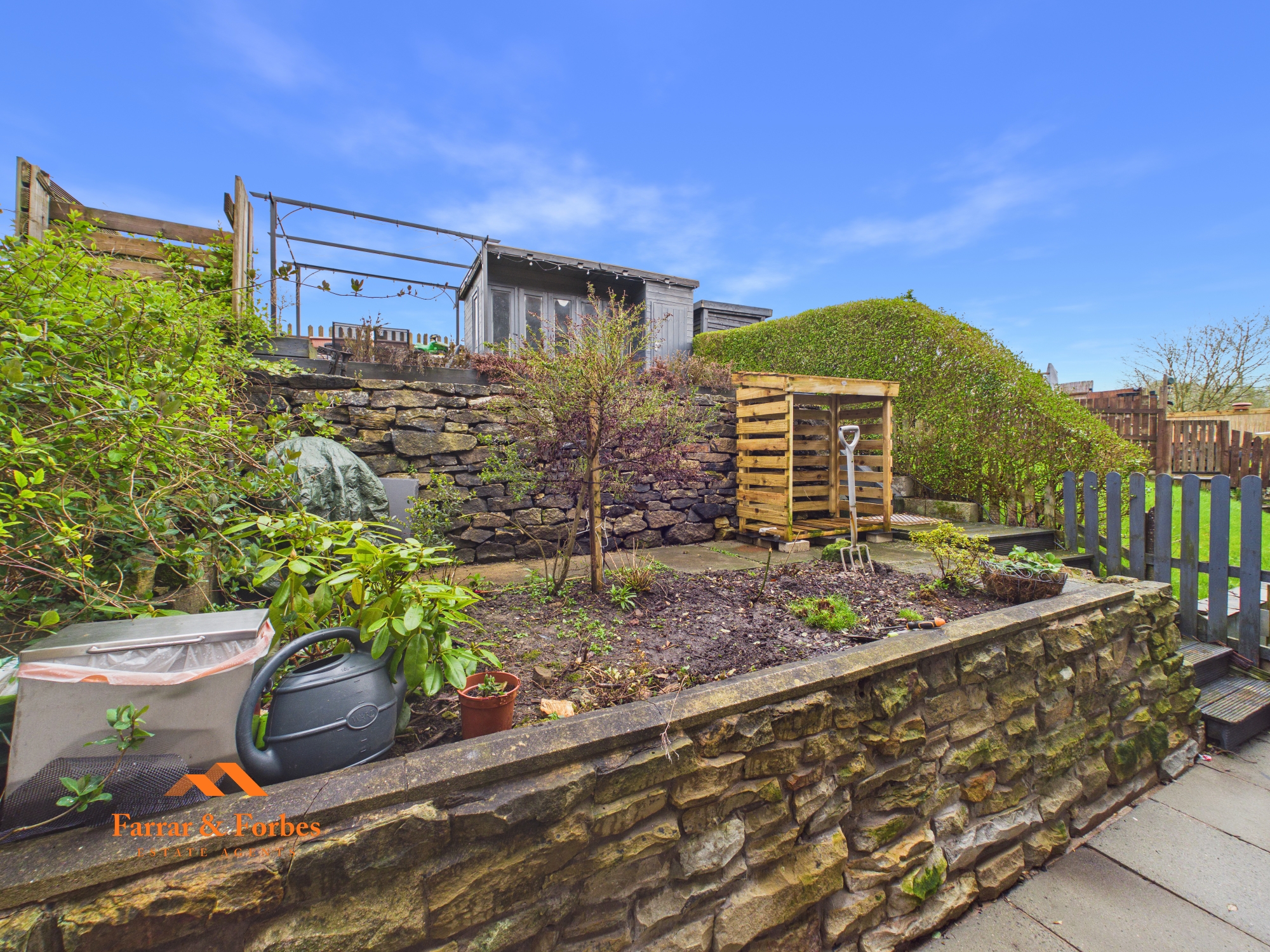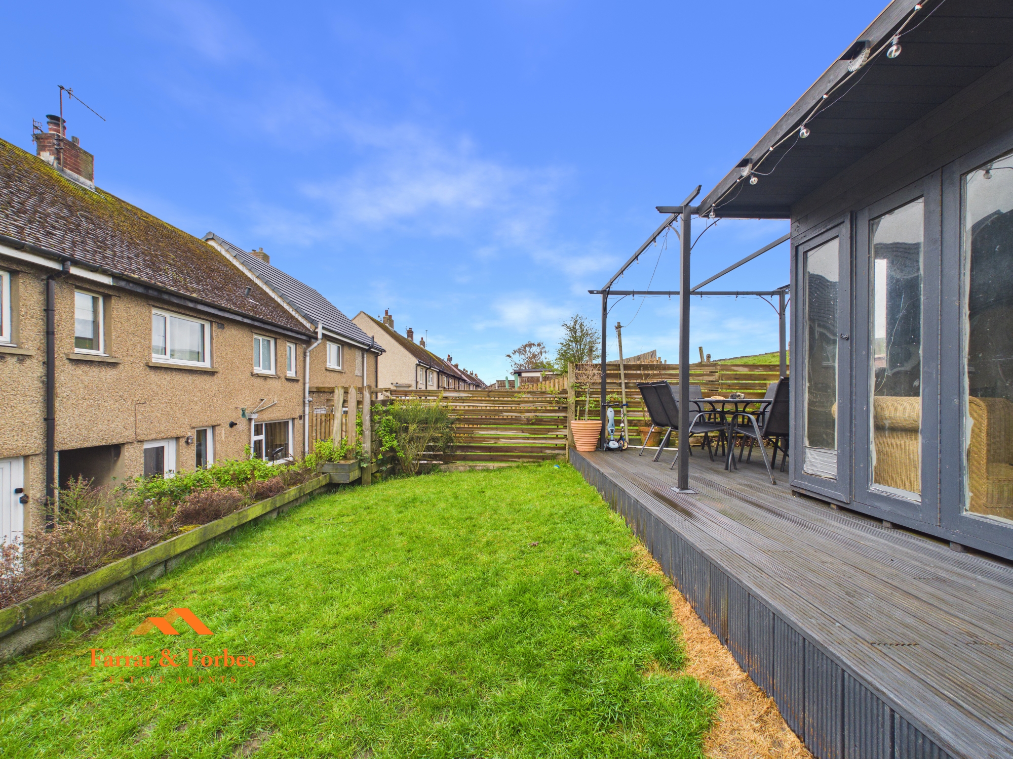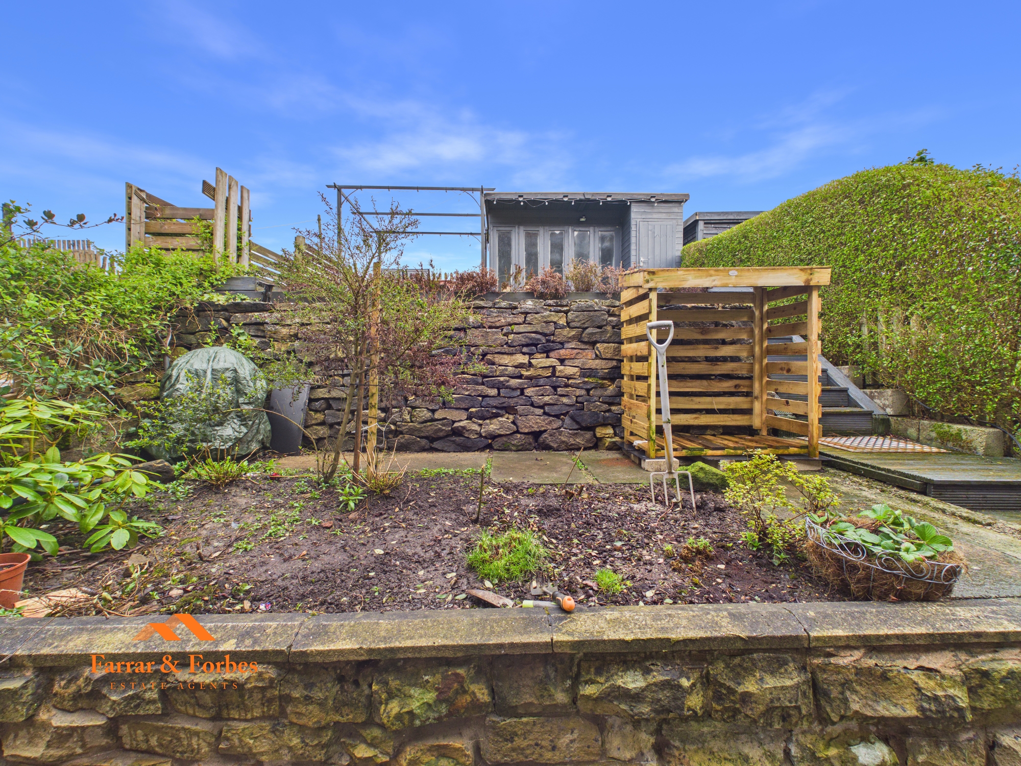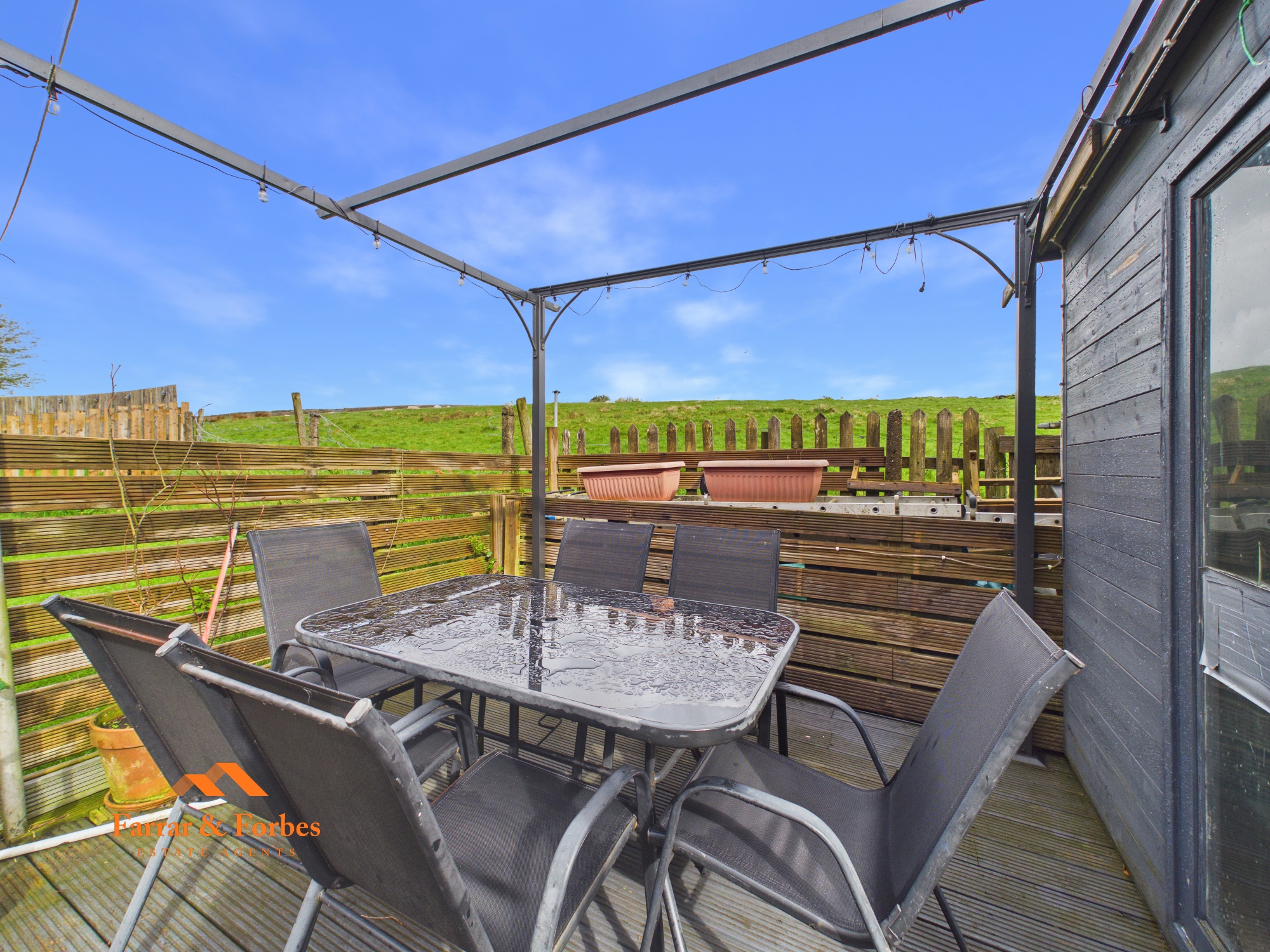 Externally, the rear garden is tiered and thoughtfully arranged, featuring flowerbeds, a lawned area, and a summer house with decking. The garden enjoys beautiful open views across fields, often with sheep grazing, providing a peaceful and scenic backdrop.