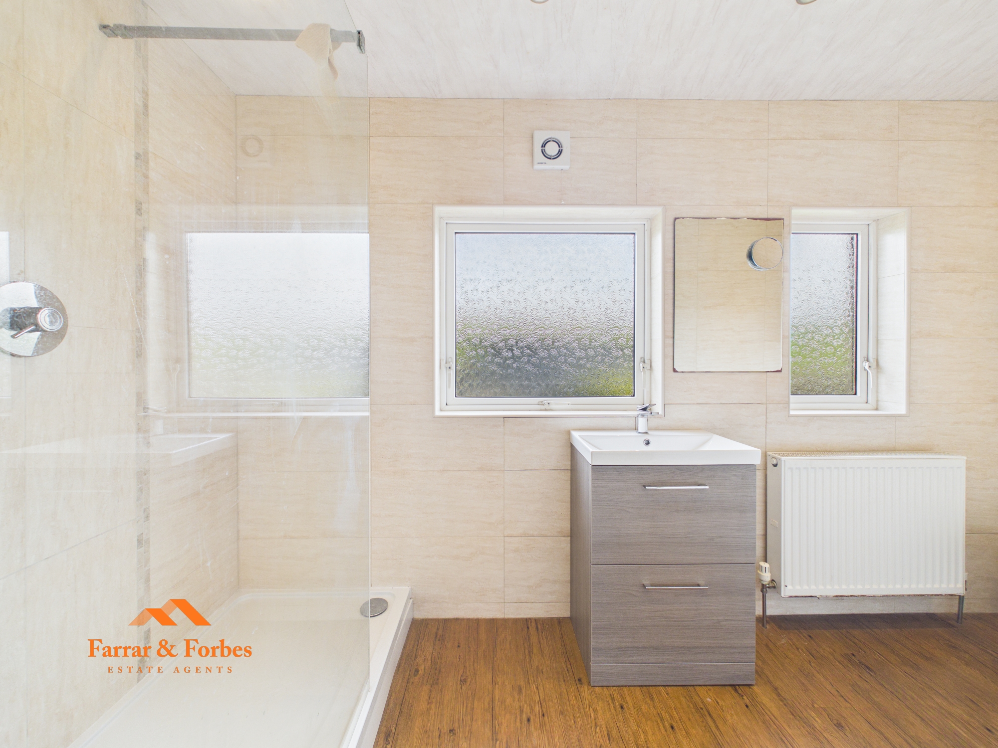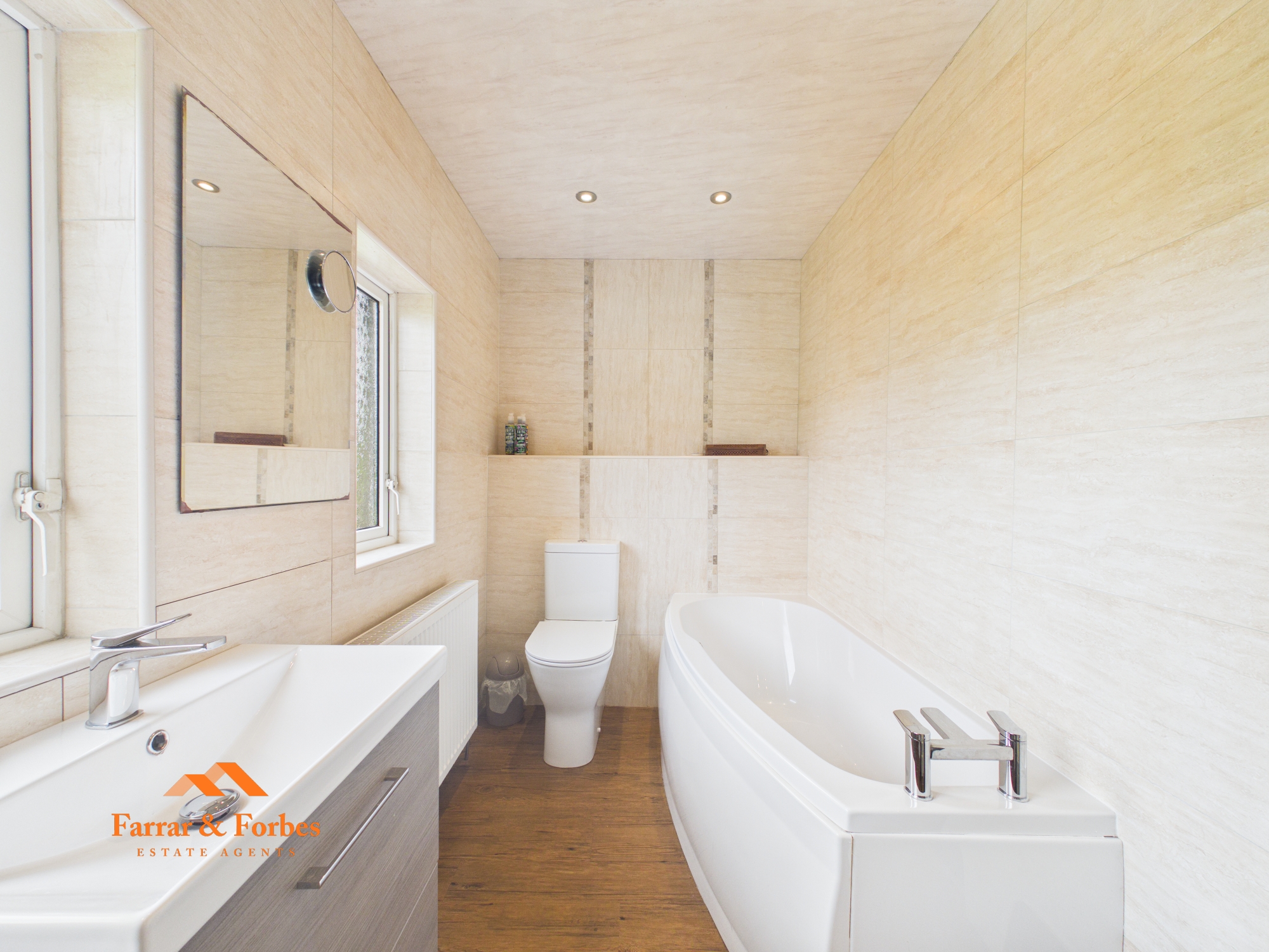 The family bathroom is fitted with a stylish four-piece suite, comprising a low-level WC, vanity hand wash basin, panelled bath, and a walk-in shower with glass screen.