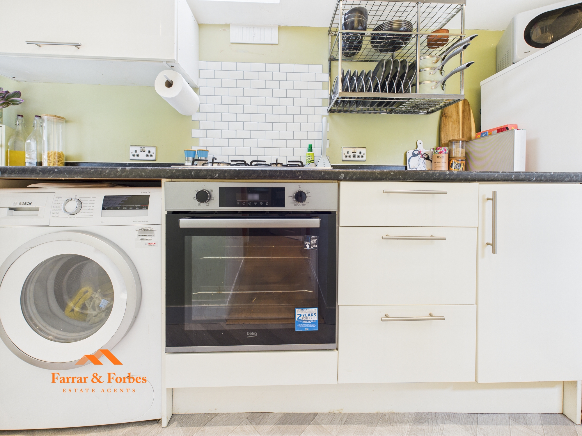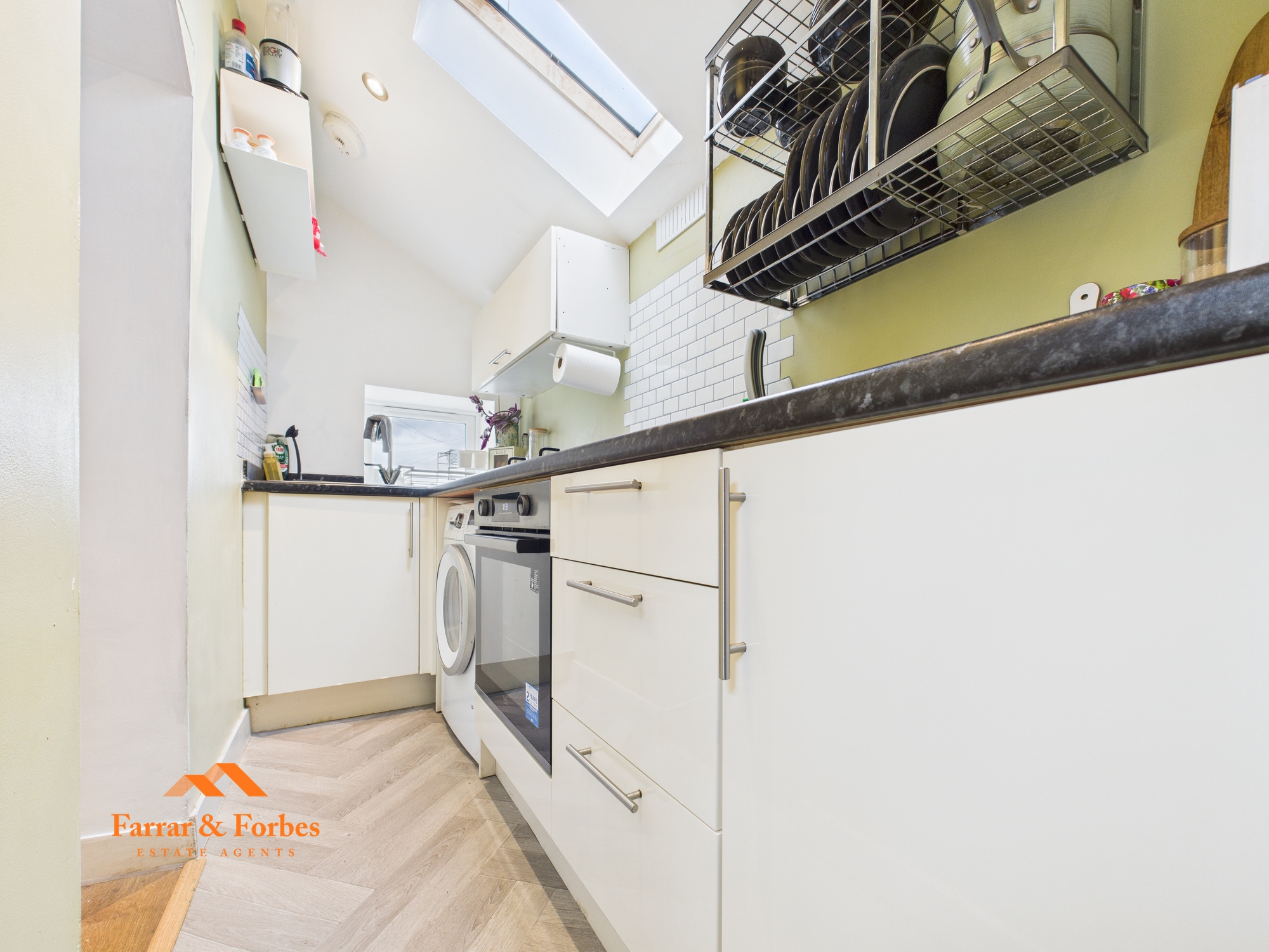 Step inside to a welcoming hallway, leading to the kitchen, arranged in an L-shape with matching wall, base, and drawer units complemented by contrasting work surfaces.