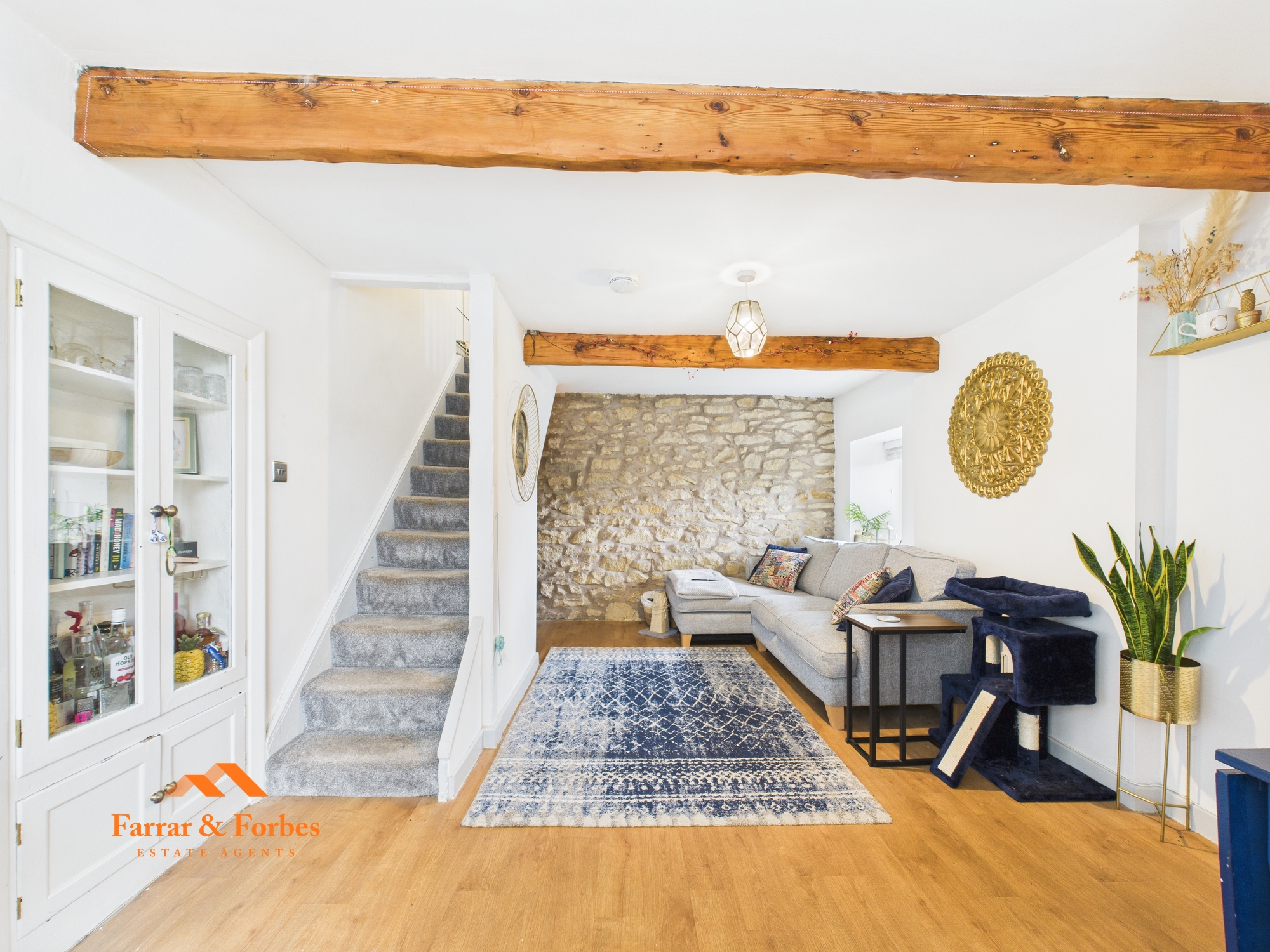 The spacious living/dining room is full of character, featuring an exposed stone wall, timber beams, and stone window ledges, creating a warm and inviting atmosphere.