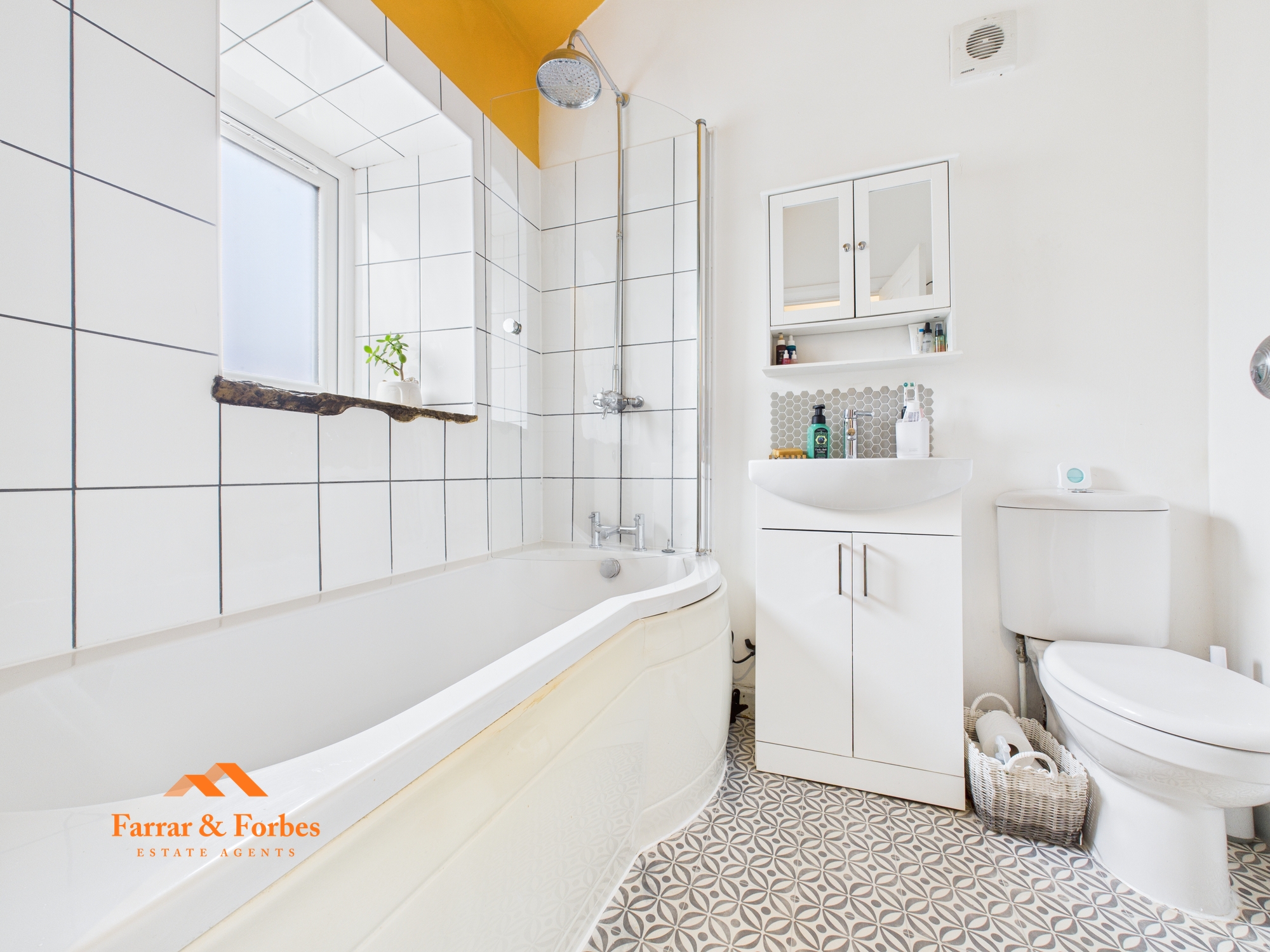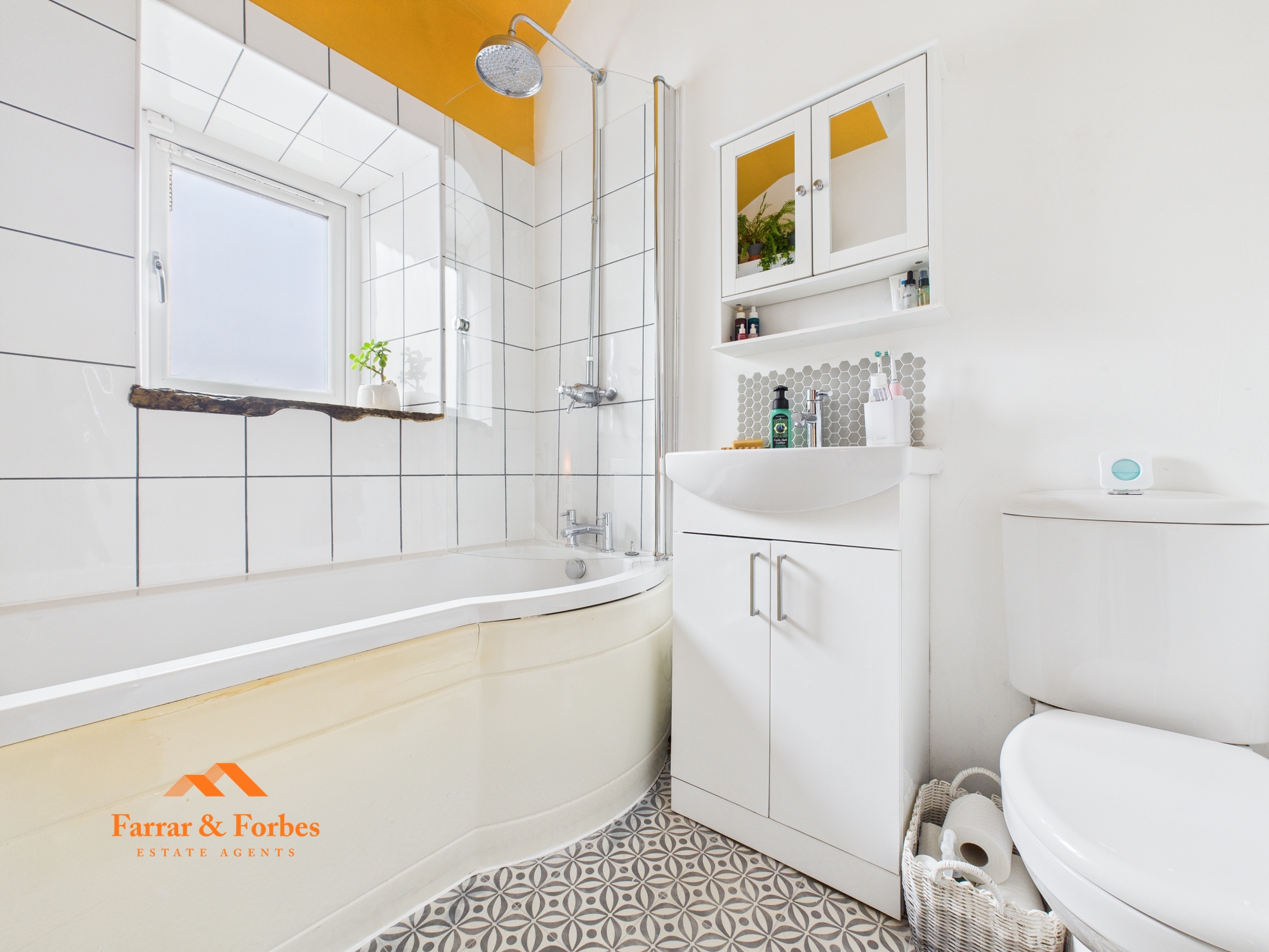 The three-piece bathroom includes a low-level WC, pedestal hand wash basin, and a P-shaped bath with an overhead shower.