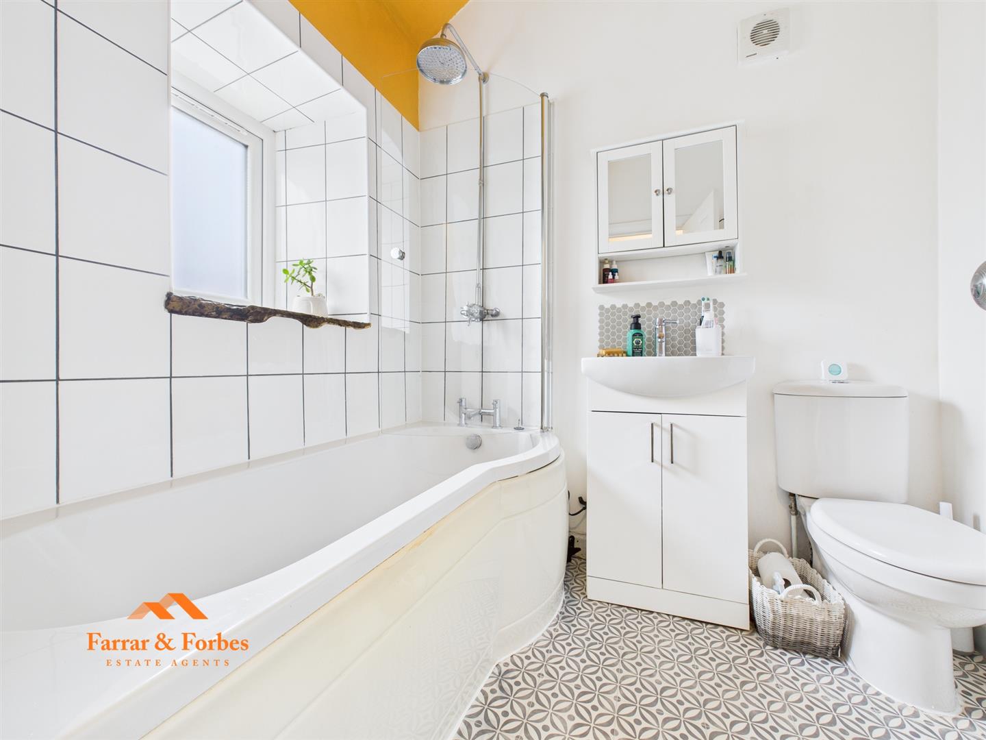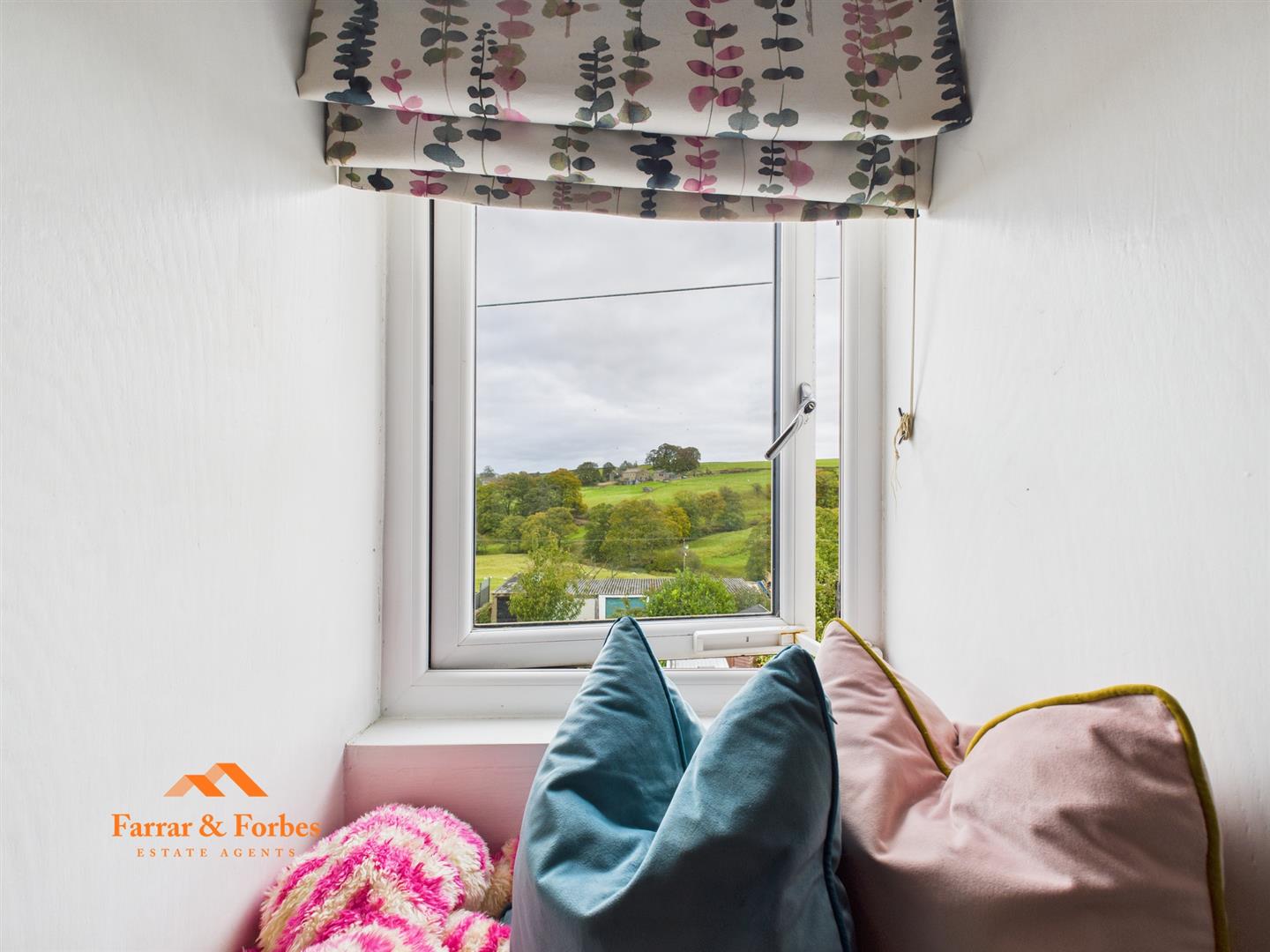Upstairs, you’ll find a double bedroom offering gorgeous views over the surrounding fields. The three-piece bathroom includes a low-level WC, pedestal hand wash basin, and a P-shaped bath with an overhead shower.
