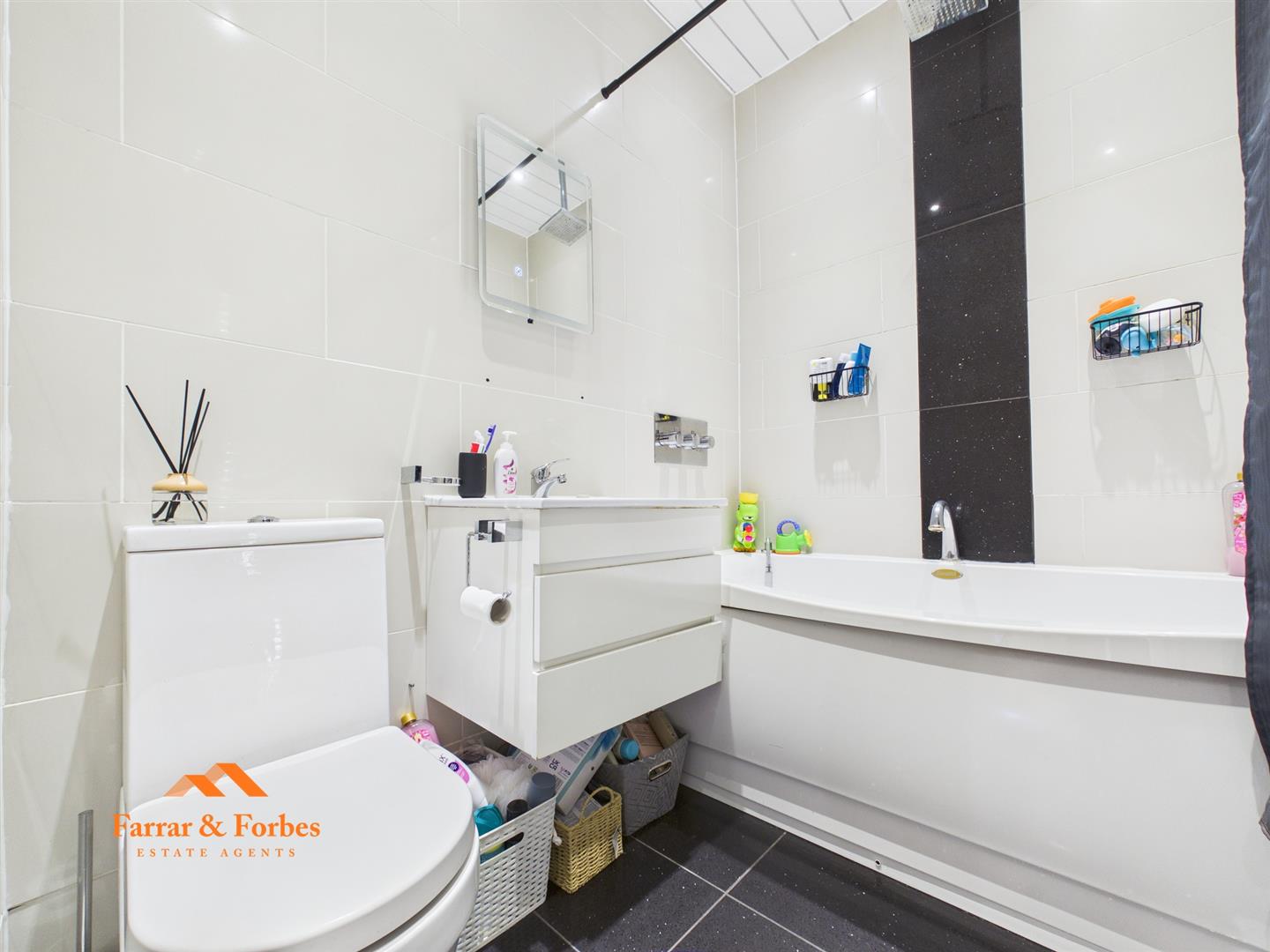 To the first floor, there are two bedrooms, comprising a spacious double and a generous single bedroom. The bathroom is fitted with a modern three-piece suite including a low-level WC, cabinet hand wash basin, and a panelled bath with rainfall shower and stylish tiled splashback.