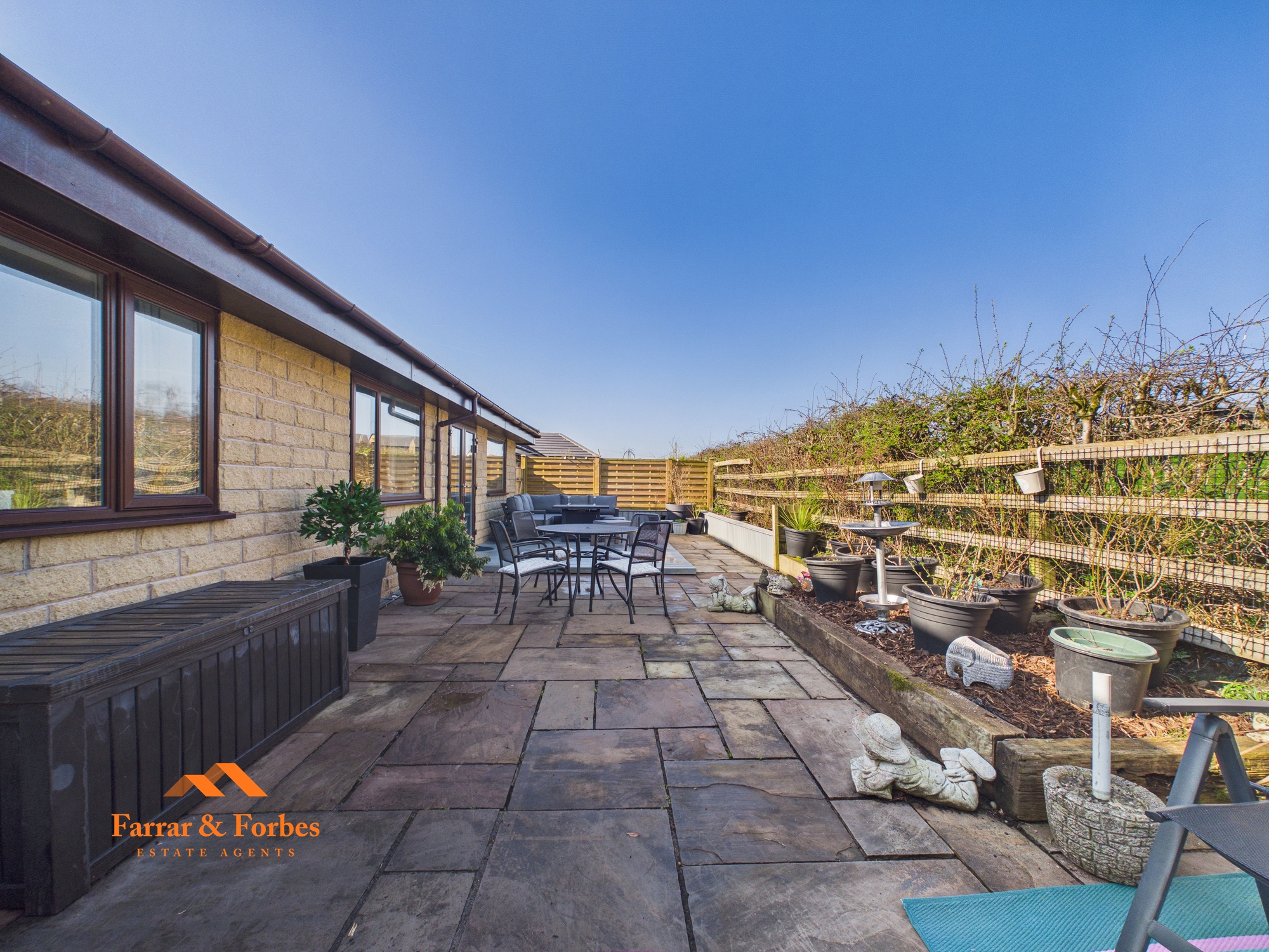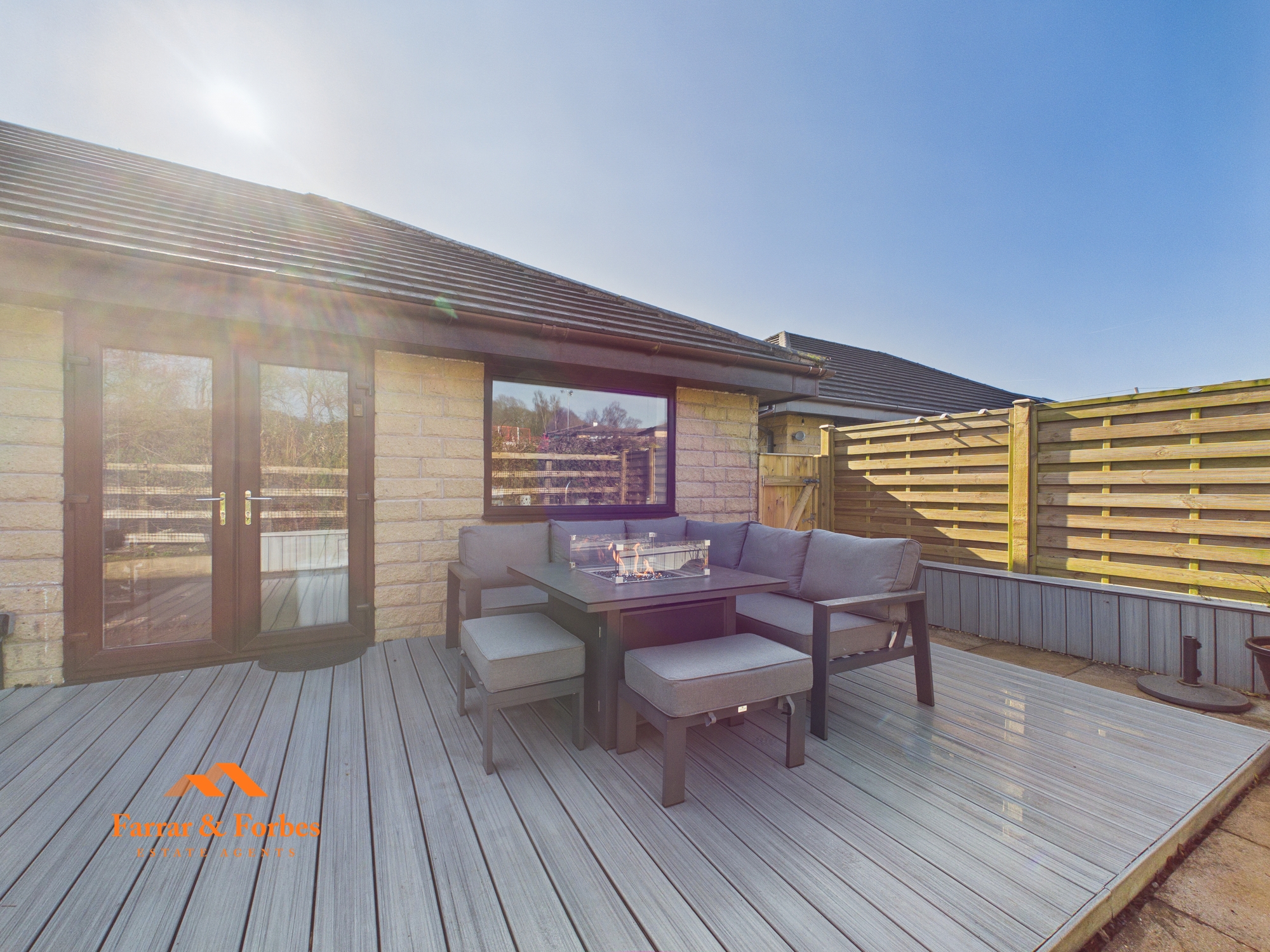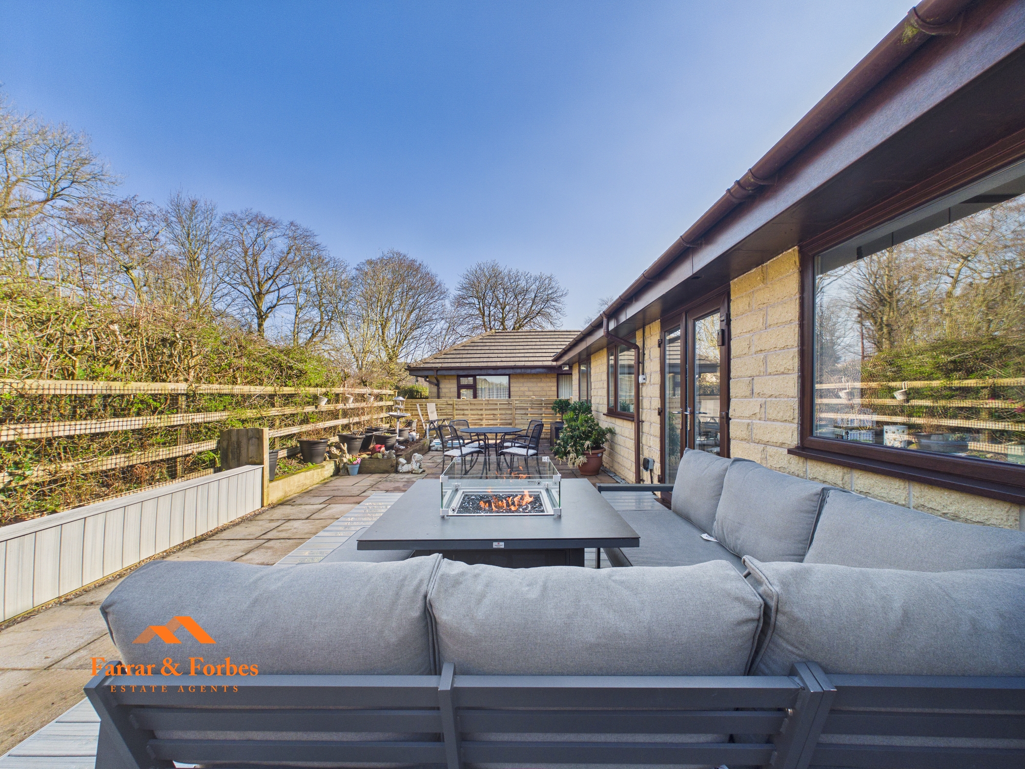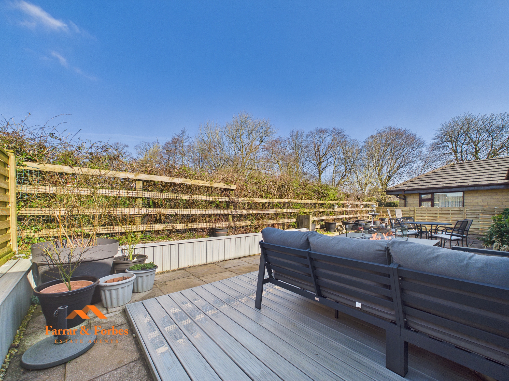 The rear garden offers a peaceful and private setting, featuring composite decking, stone-flagged seating areas, and a fire pit. Designed for low maintenance, it still provides the perfect space for potted plants and entertaining family and friends.