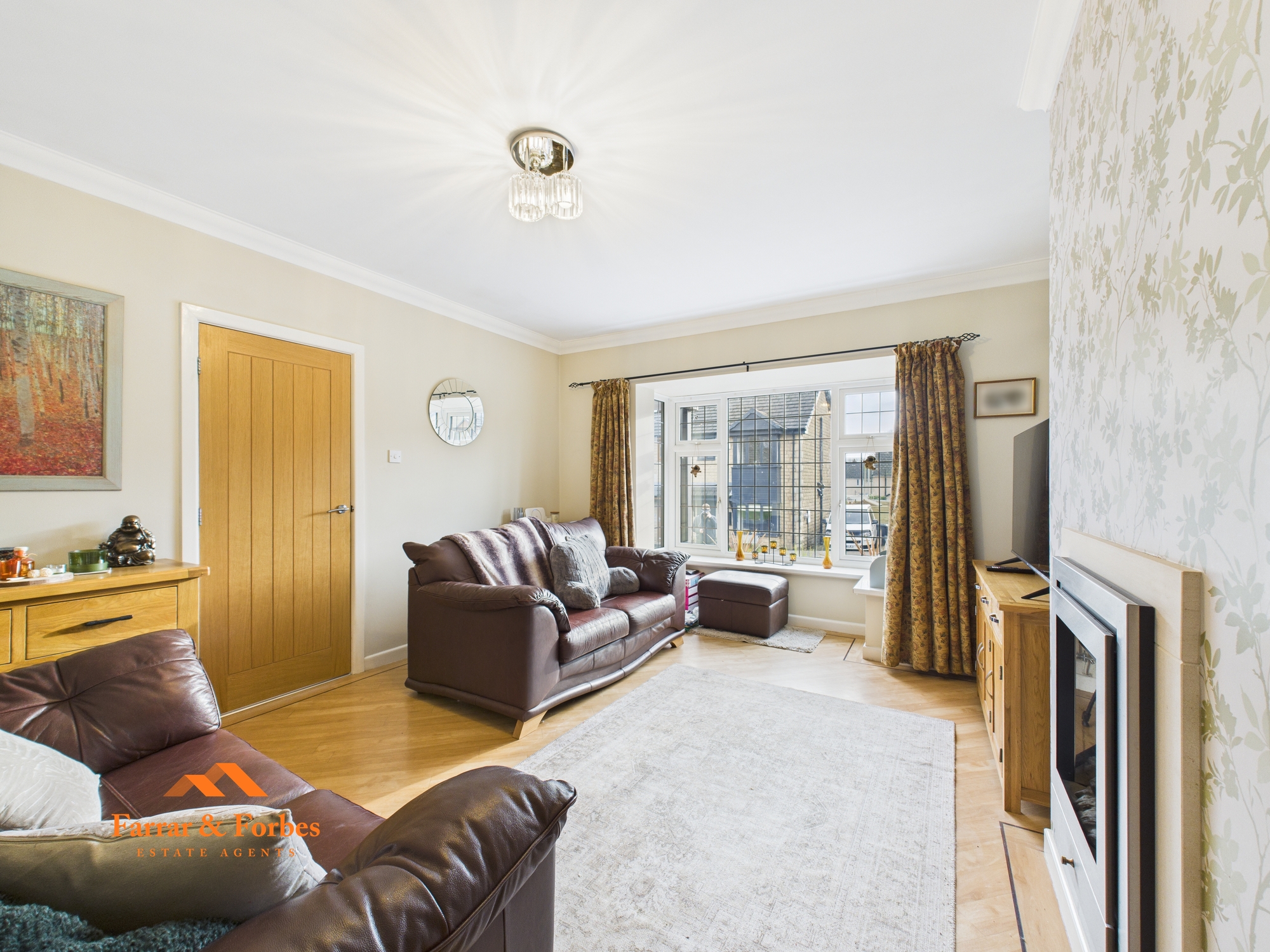 To the front of the property, the spacious lounge is bright and welcoming, featuring a bay window and an elevated gas fire that creates a striking focal point. Karndean flooring runs through the lounge, enhancing the sense of flow and quality throughout the home.