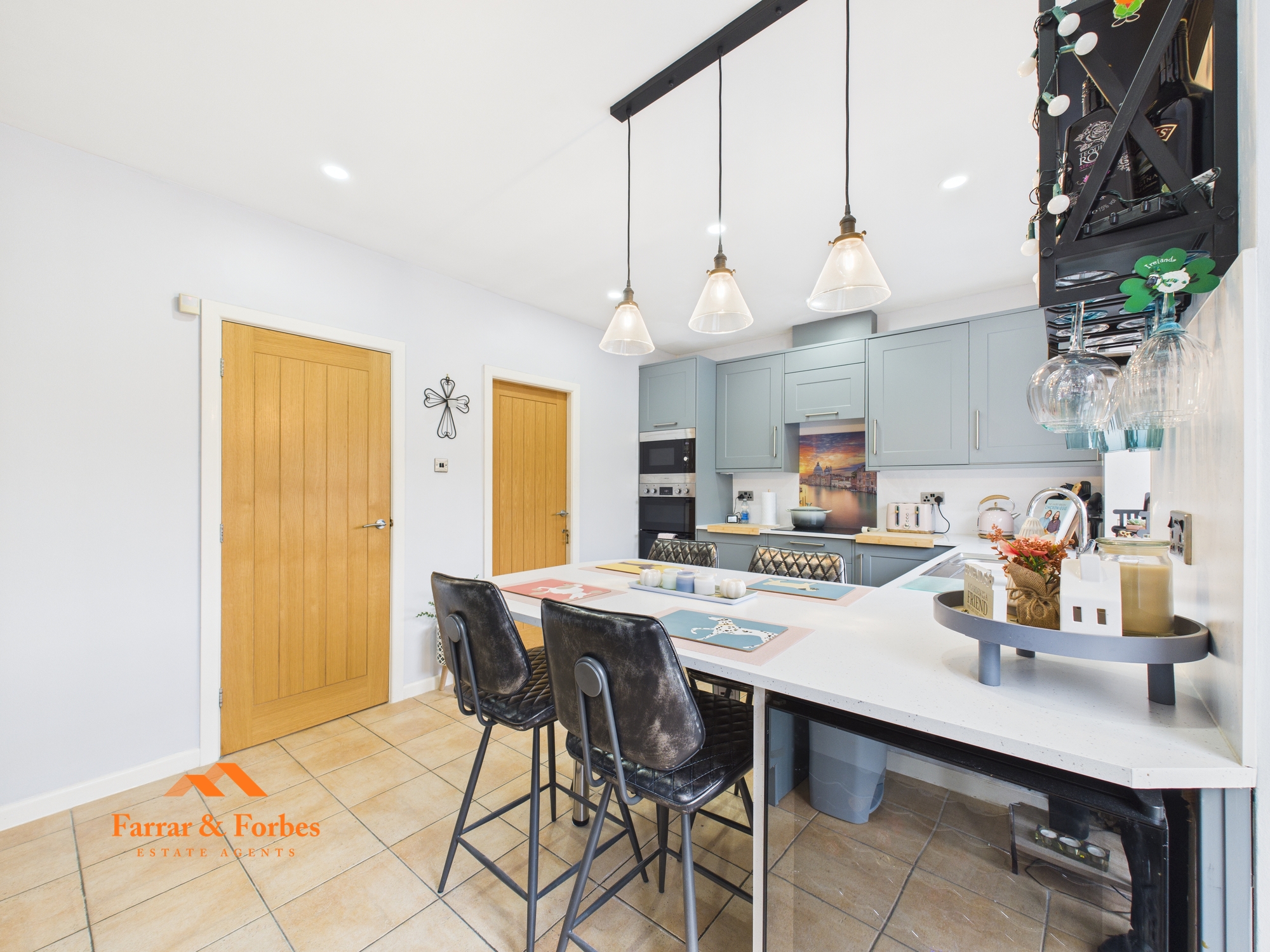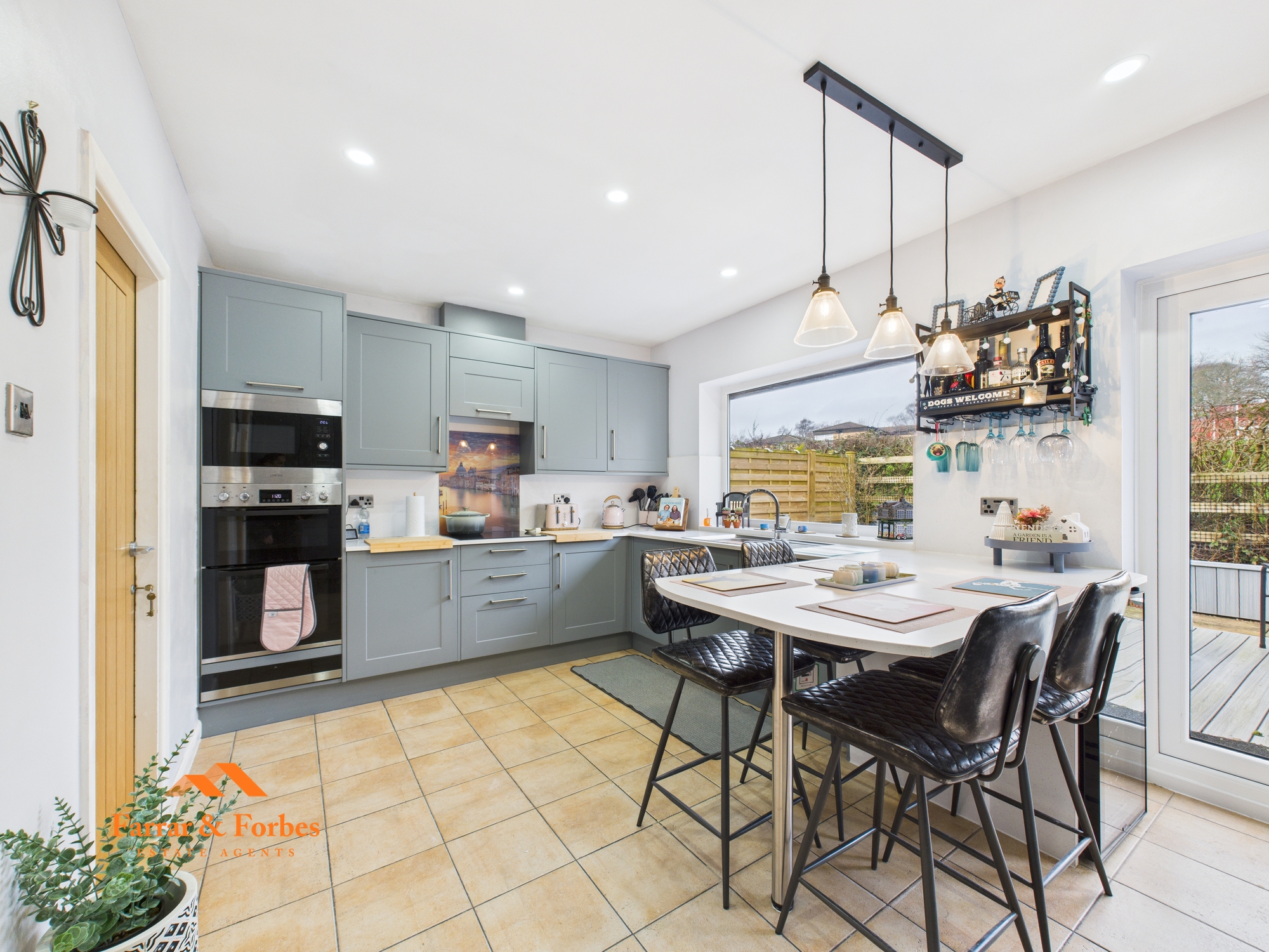 Approaching the property, a block-paved driveway provides off-road parking and leads to the integral single garage, fitted with a manual up-and-over door. To the rear of the property is a stunning, modern fitted kitchen arranged in a practical horseshoe layout. Integrated appliances include an electric oven, grill, microwave, washing machine, and dishwasher. A wrap-around breakfast bar creates additional space for full length fitted kitchen cupboards and storage. Patio doors open out onto the rear garden and composite decking, seamlessly blending indoor and outdoor living.