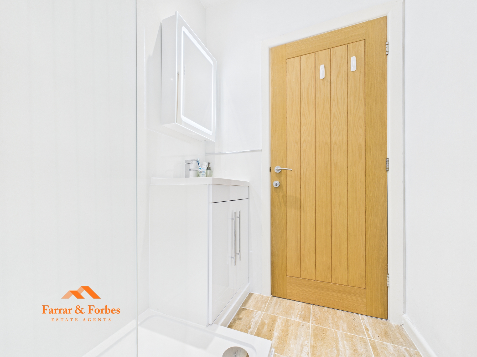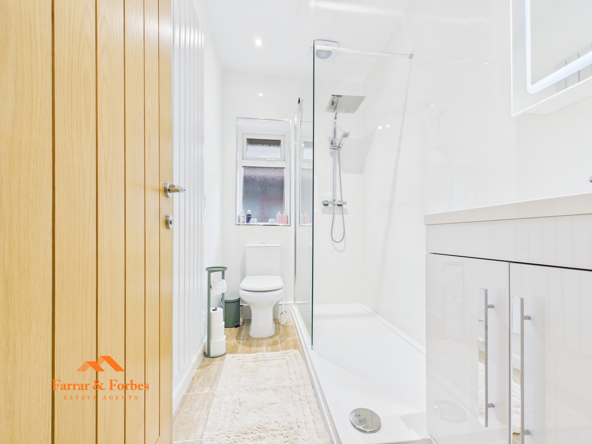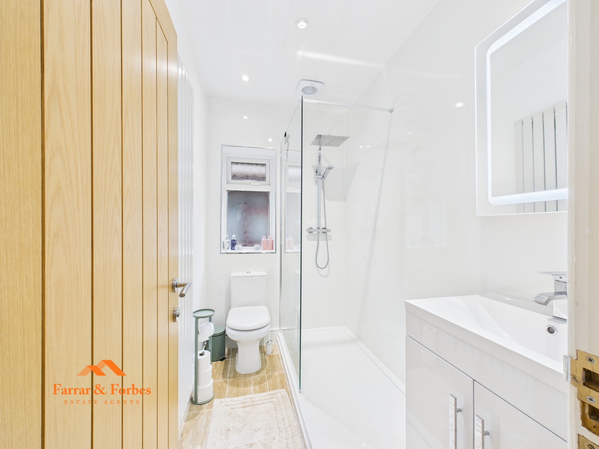 The contemporary three-piece bathroom comprises a low-level WC, a cabinet hand wash basin with an illuminated mirror, and a walk-in rainfall shower with a sleek glass screen.