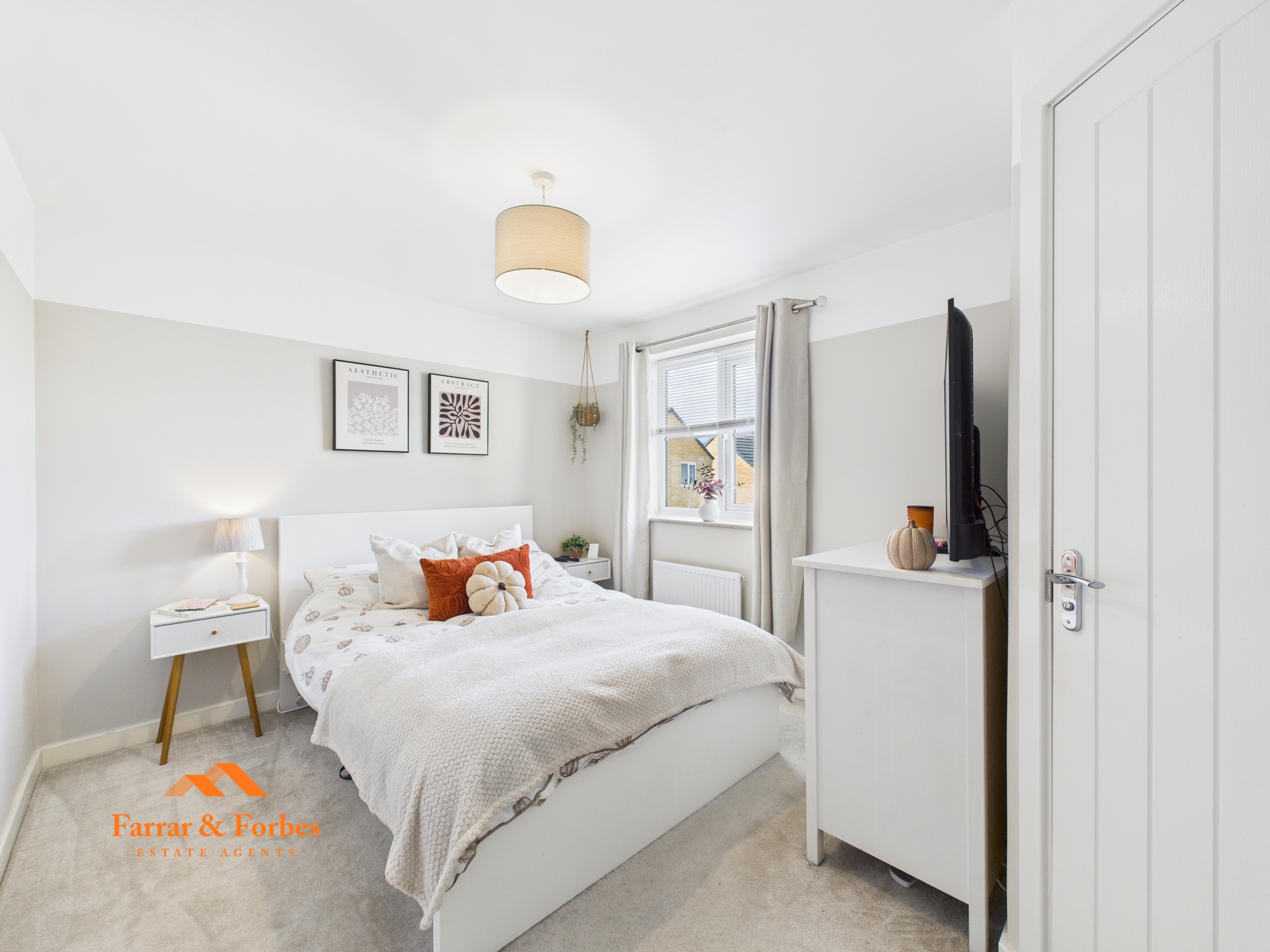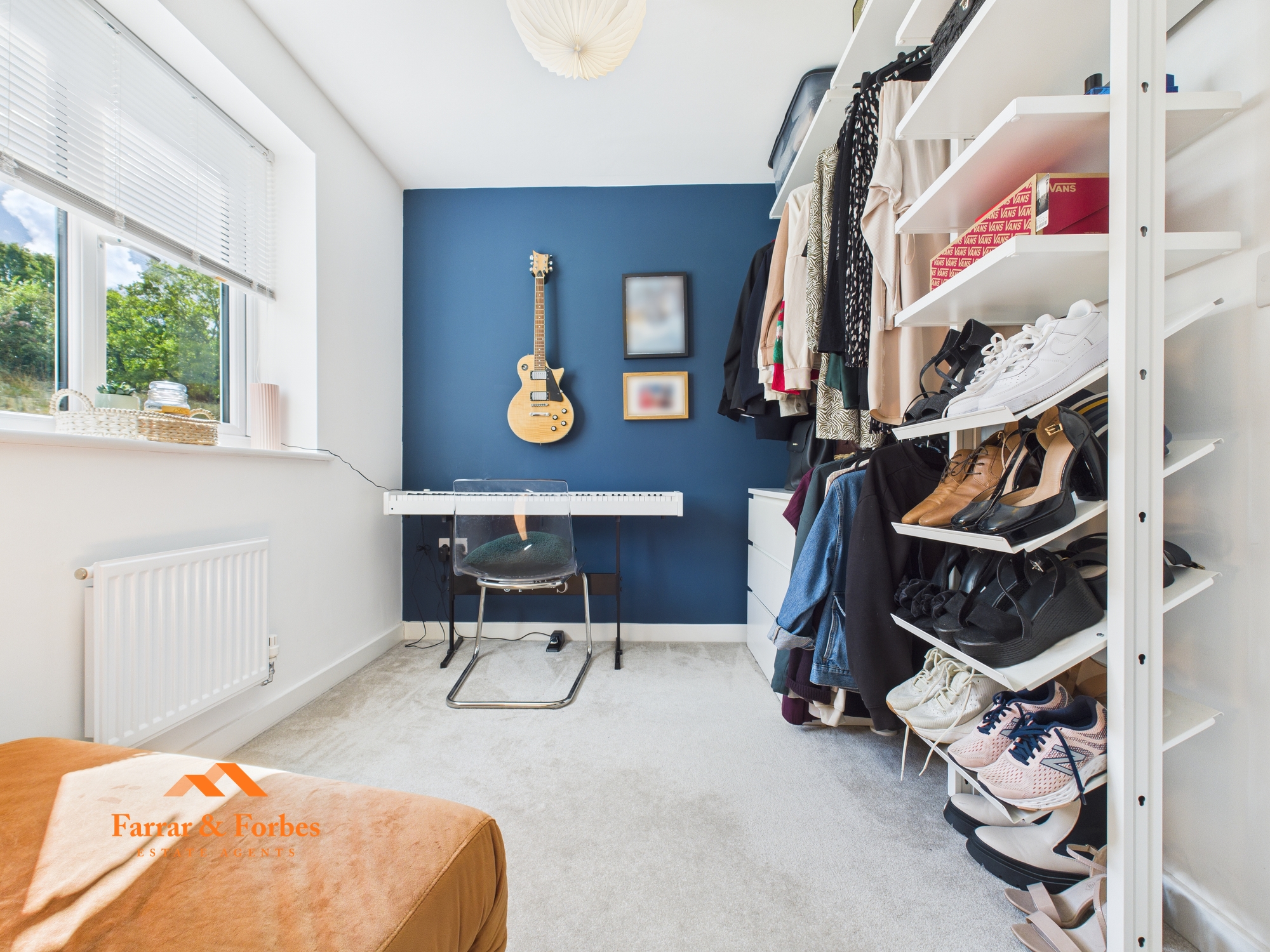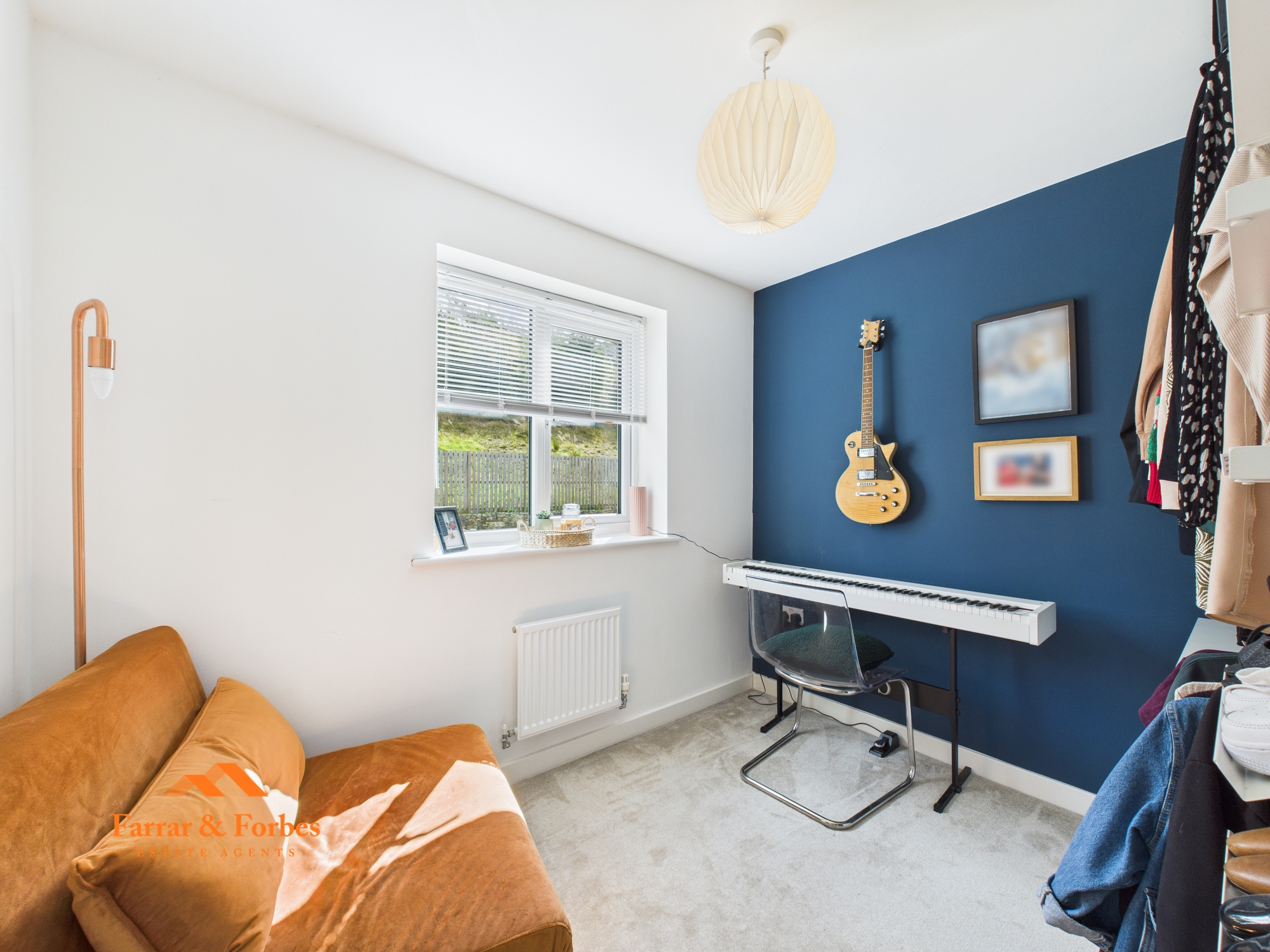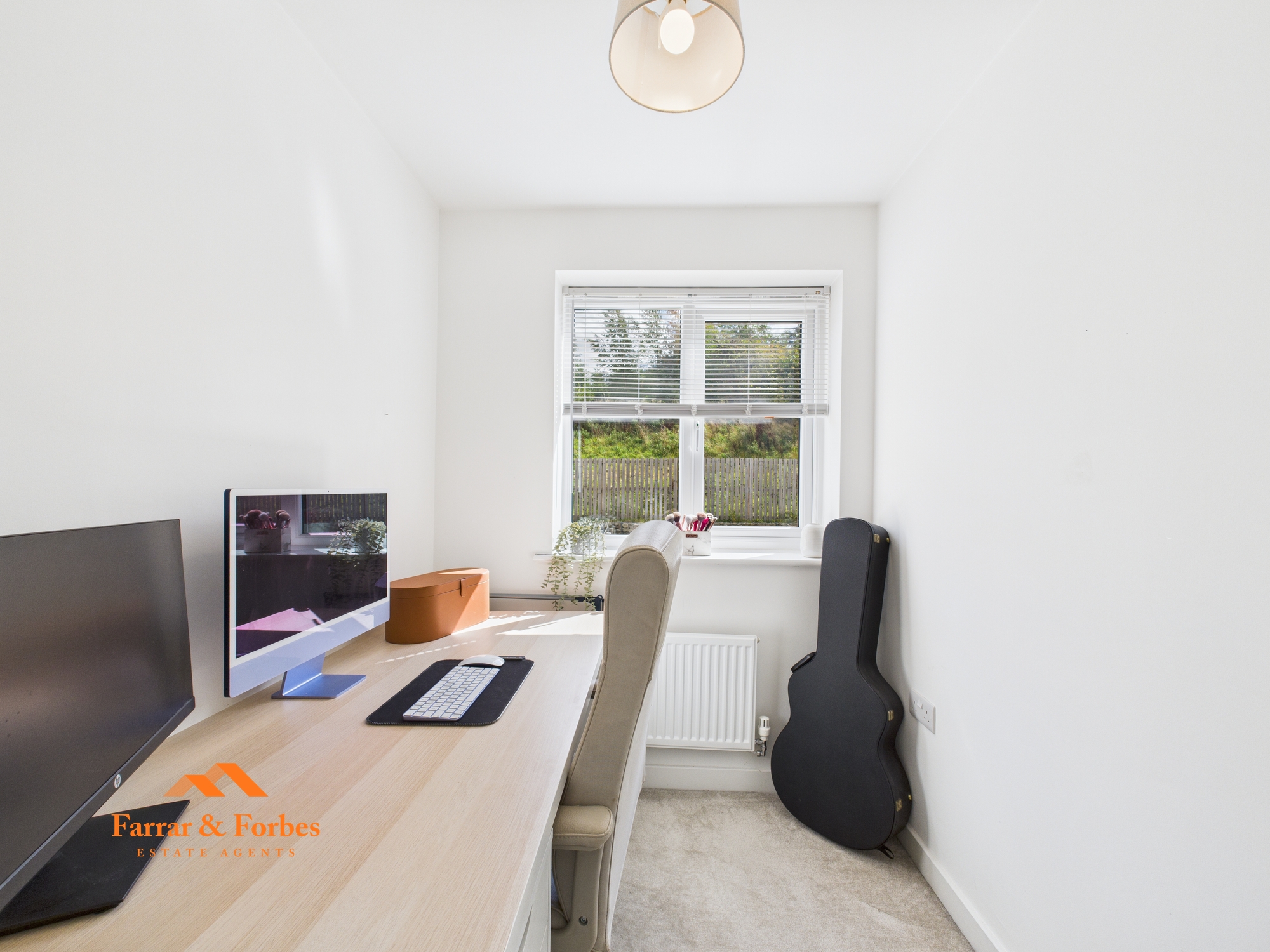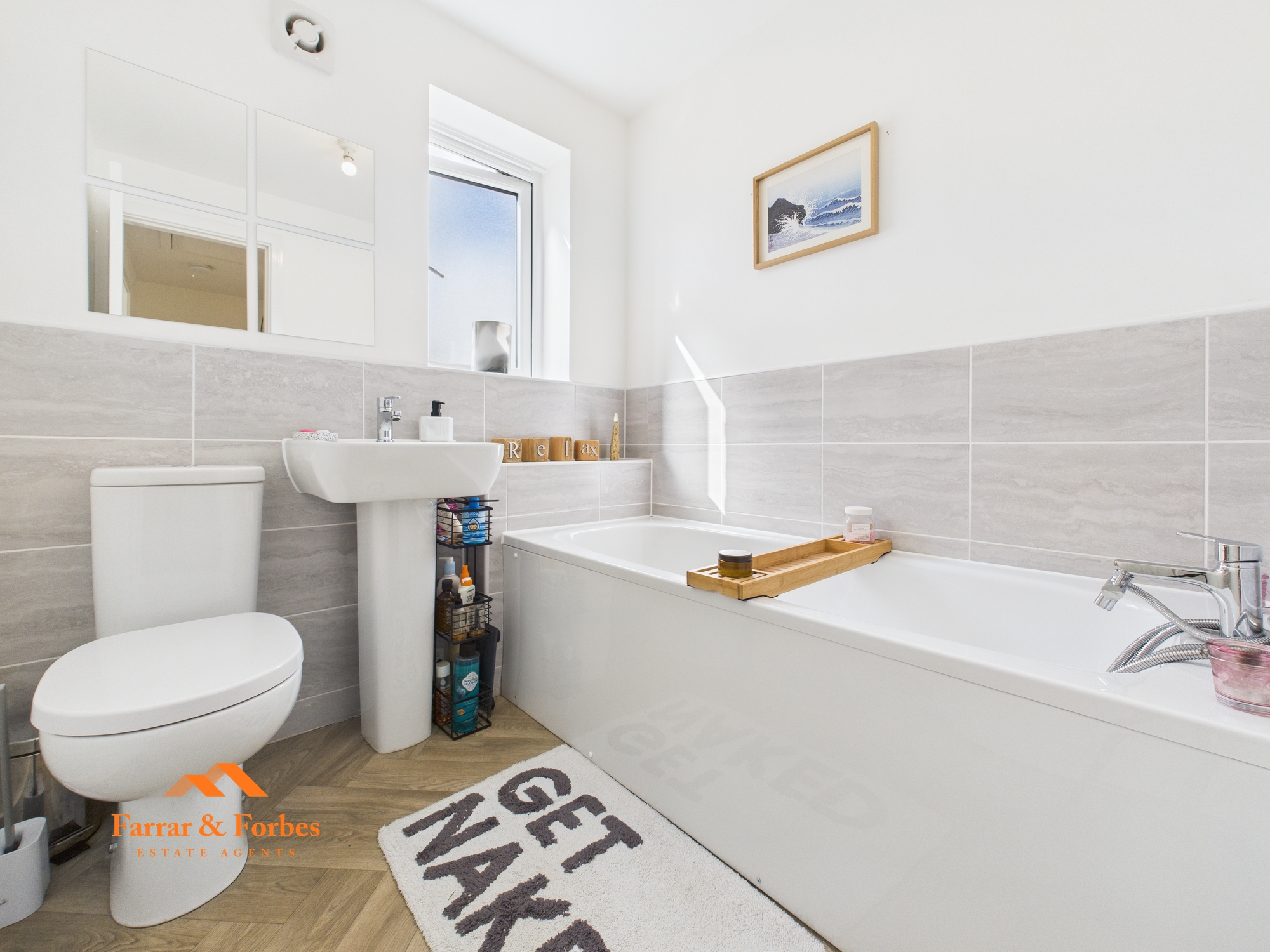 Upstairs, there are two double bedrooms and a generously sized single, currently used as a home office. The main bedroom offers beautiful views, a storage cupboard, and a modern en-suite with quadrant shower, WC, and wash basin. Completing the first floor is a stylish family bathroom with panelled bath, WC, and wash basin.