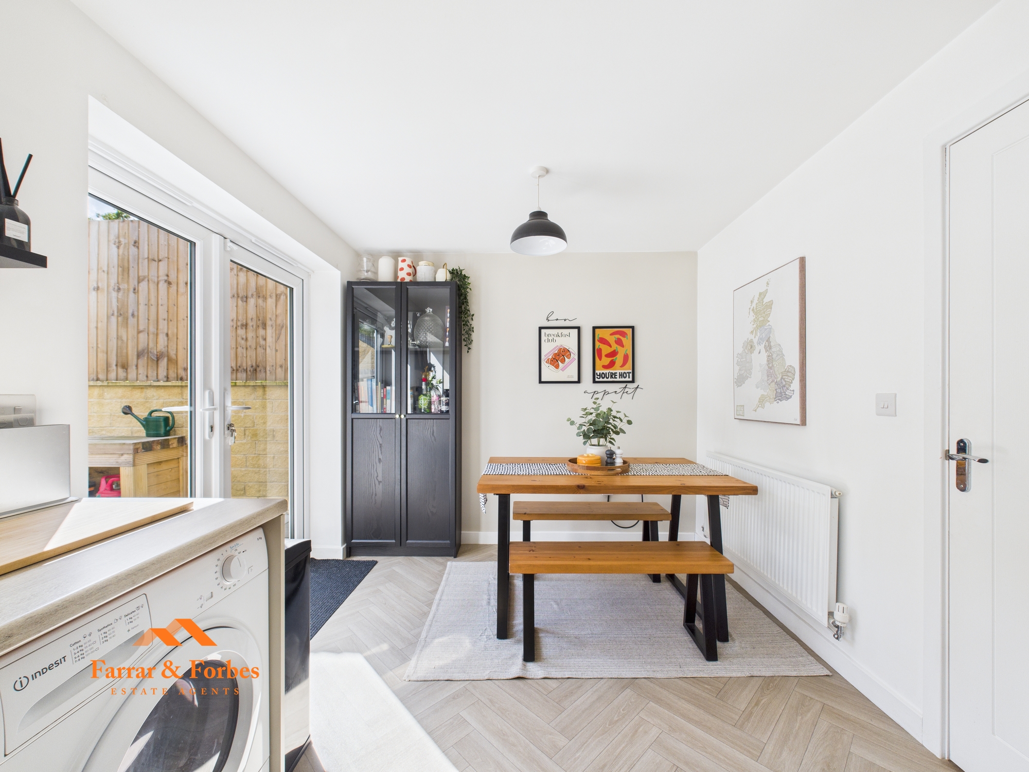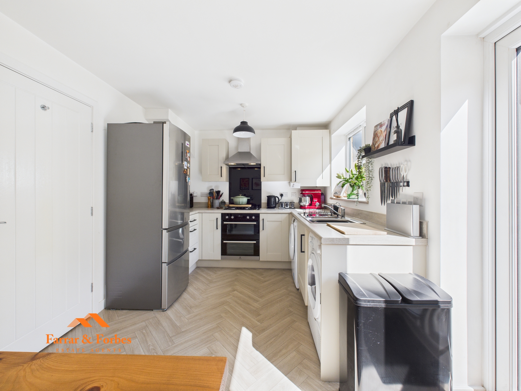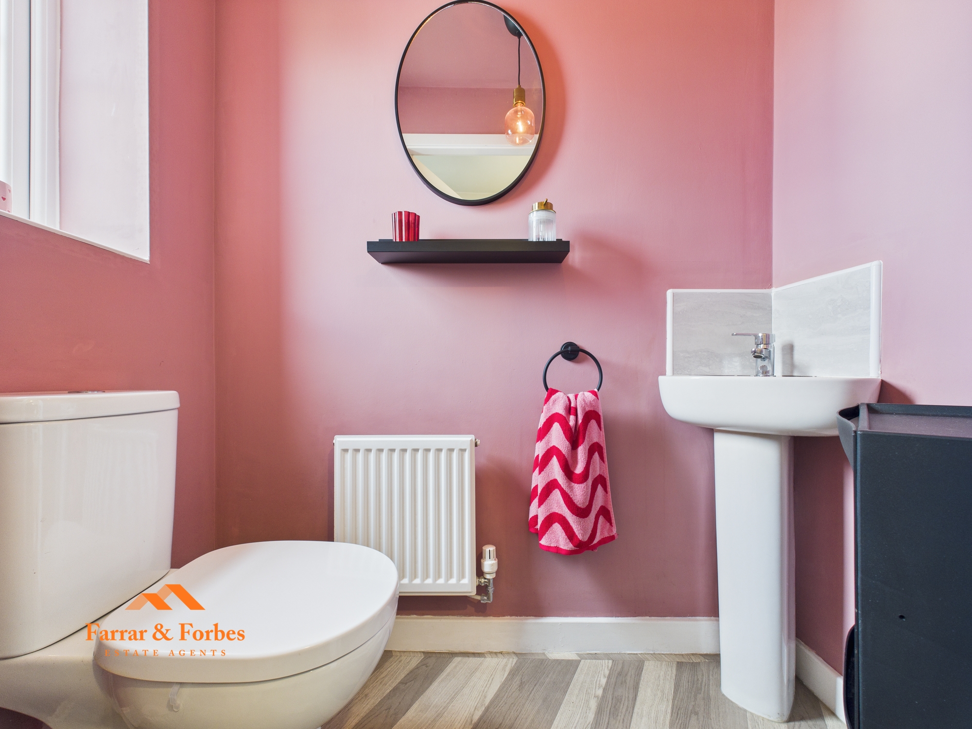 On approach, the home boasts an elevated position with a double driveway and a charming pink composite front door. Inside, the ground floor comprises a welcoming hallway with a downstairs WC, a spacious lounge with under-stairs storage, and a modern open-plan kitchen/diner. The kitchen is fitted in a practical horseshoe arrangement with matching units and contrasting worktops, while patio doors open out to the landscaped rear garden.