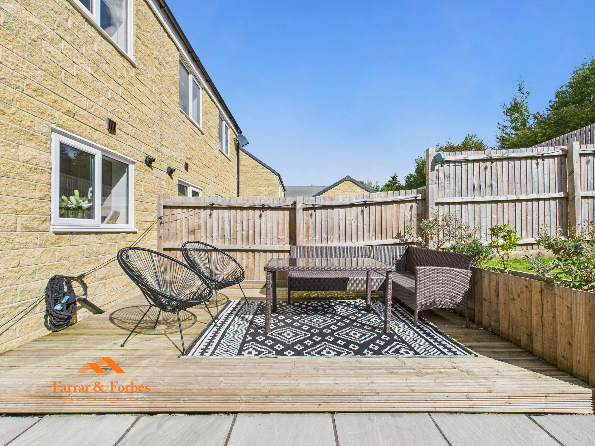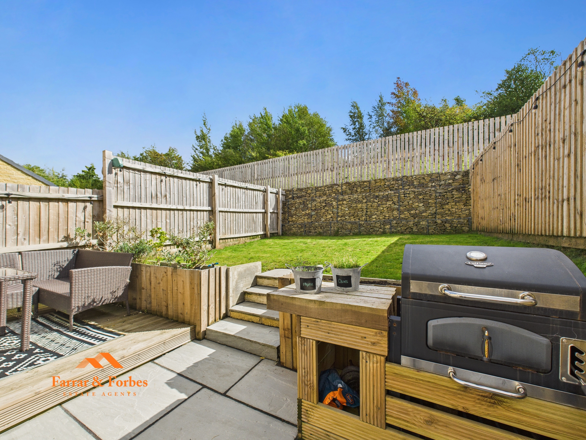 The garden is ideal for entertaining, featuring stone-flagged patios, a decked seating area, a built-in BBQ station, raised lawn, and a quirky stone-built retaining wall. The space is private, not overlooked, and enjoys plenty of sunshine throughout the day.